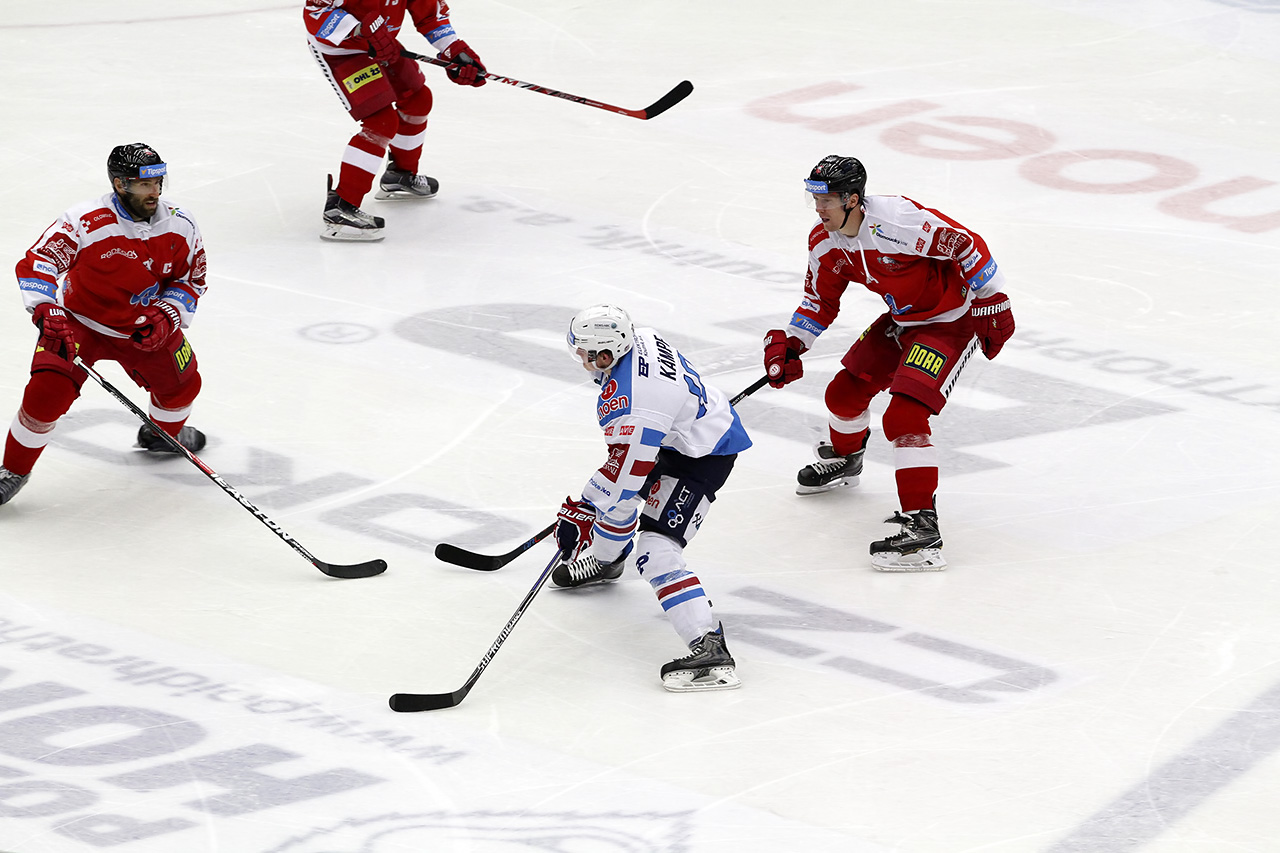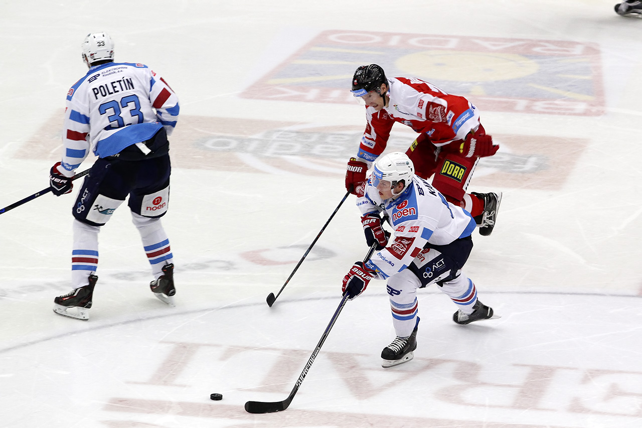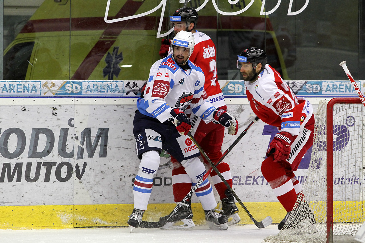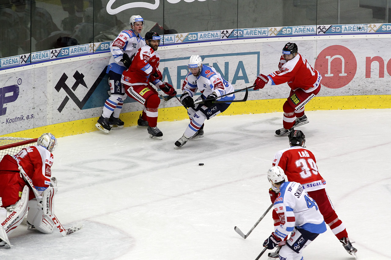 Vladimír Růžička blokuje Jana Knotka, Ondřej Dlapa vyráží za pukem