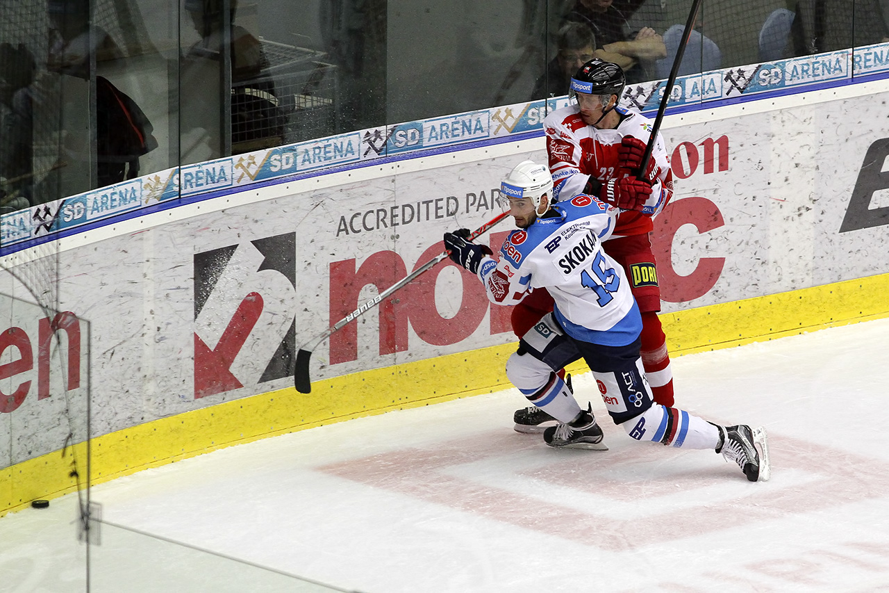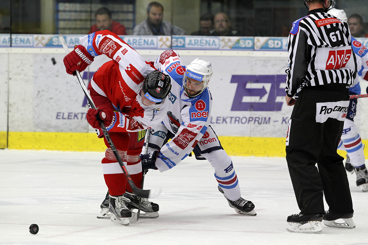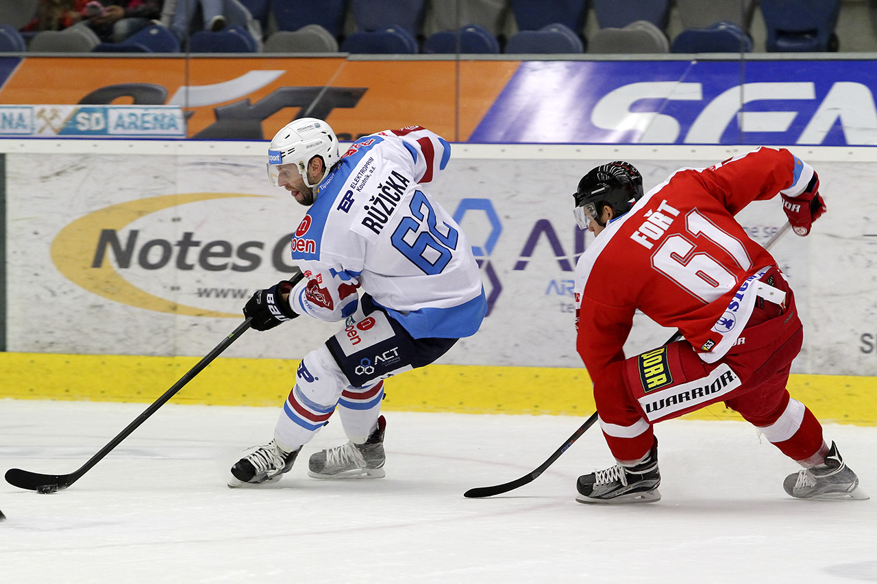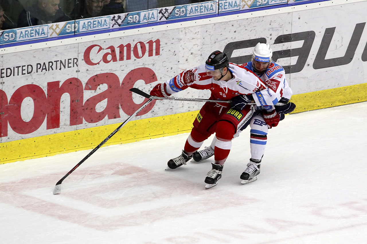 Vladimír Růžička si kryje kotouč před napadajícím Davidem Ostřížkem