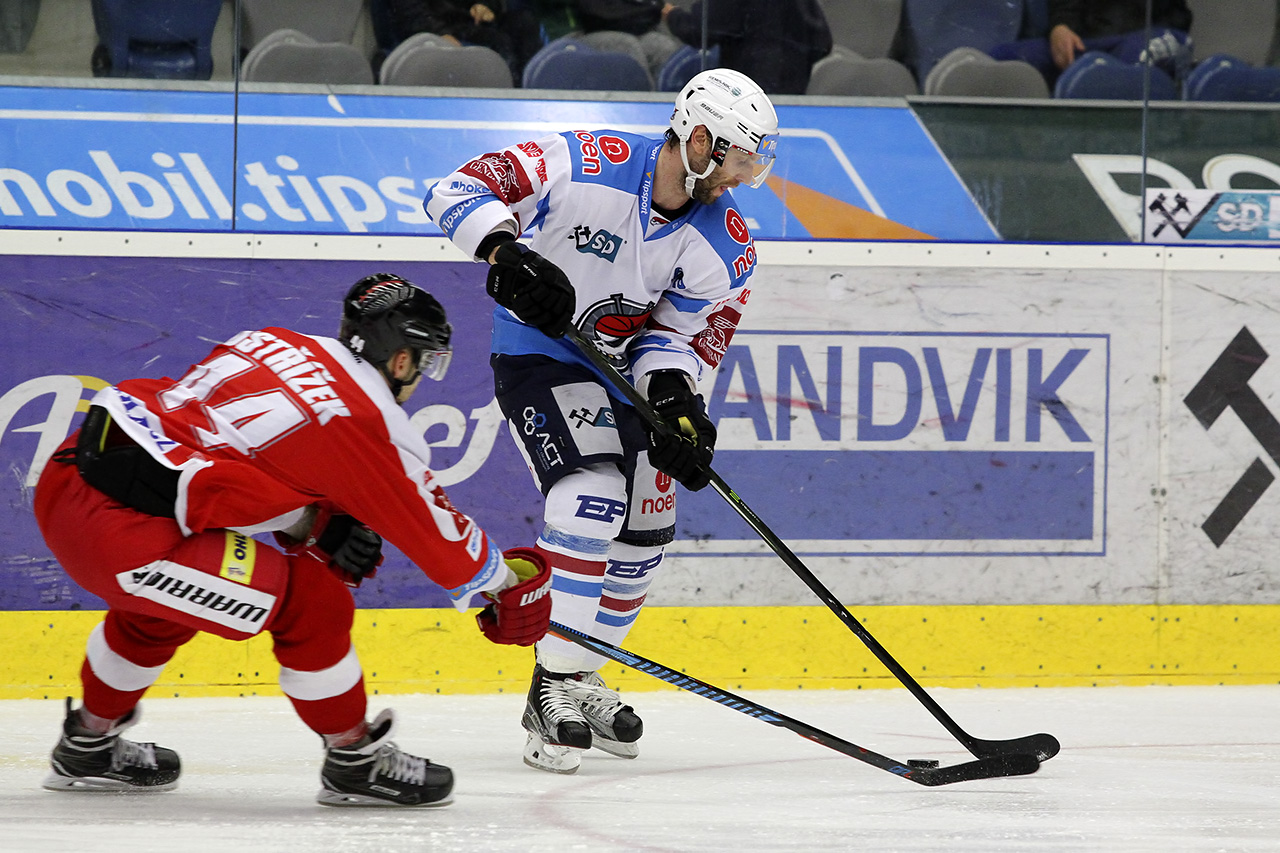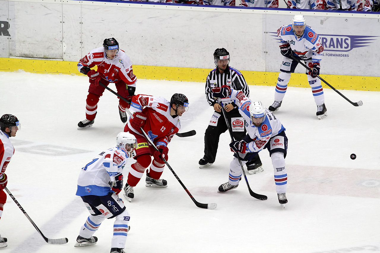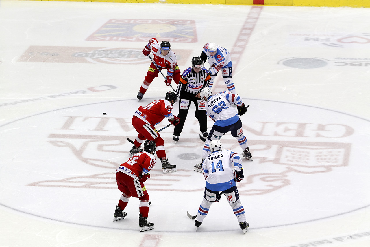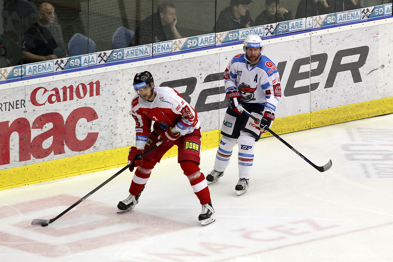 Vladimír Růžička si kryje kotouč před napadajícím Davidem Ostřížkem