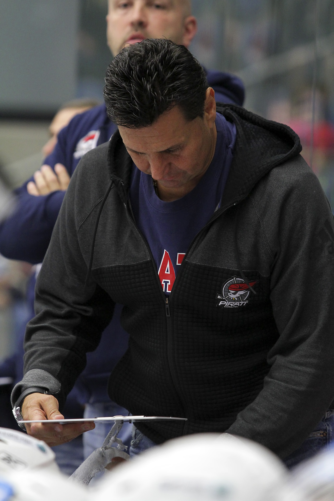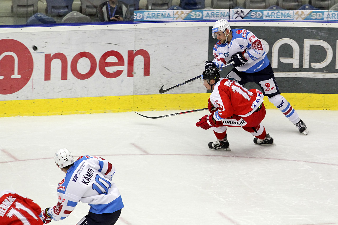 Michal Vondrka i přes dotírání Jana Eberleho natahuje ke střele, ke smůle Pirátů domácí kapitán ani jednou netrefil branku