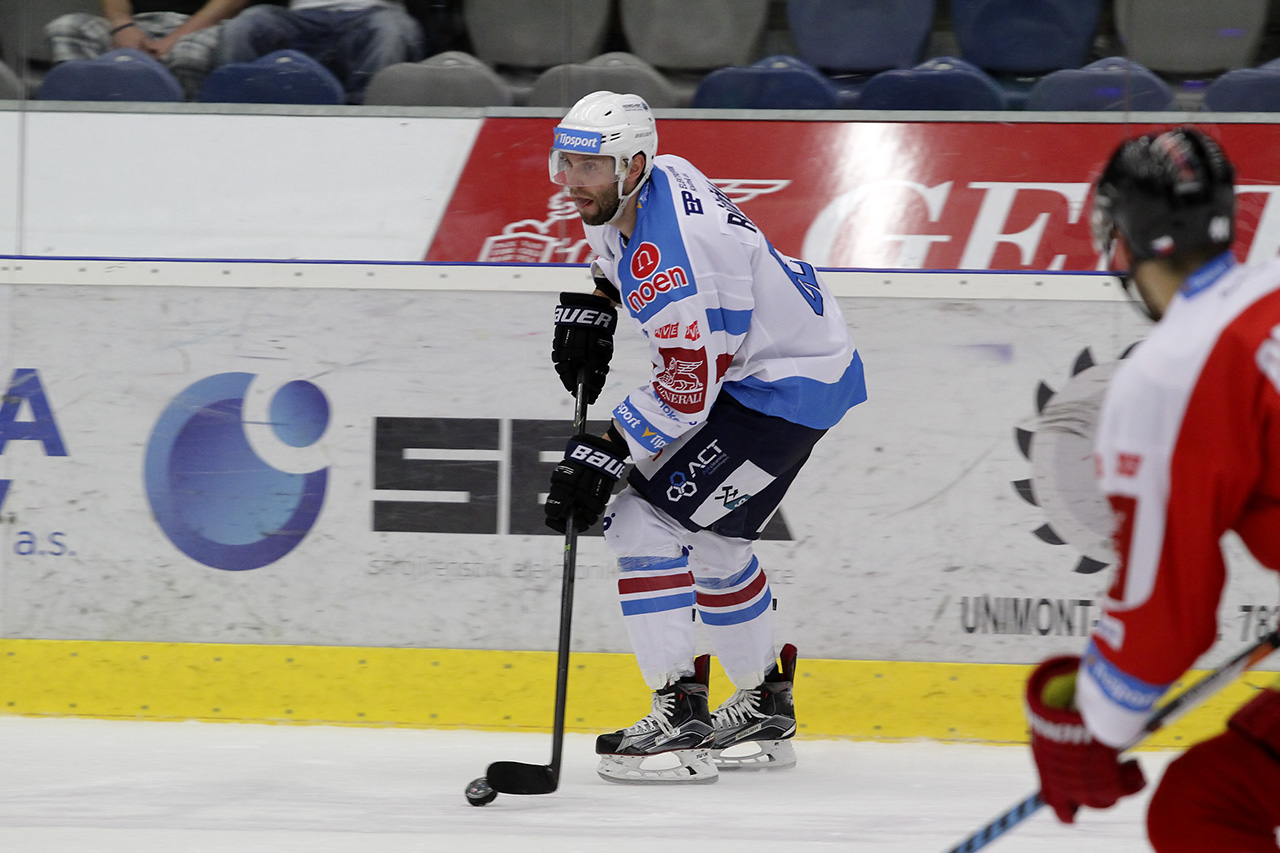 Brett Skinner s pukem na holi za olomouckou brankou hledá, kudy by spoluhráčům přihrál do šance