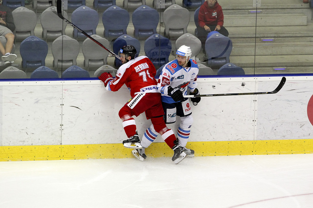 Martin Šťovíček se postavil na pět vhazování, tady bojuje o puk s Jakubem Hermanem