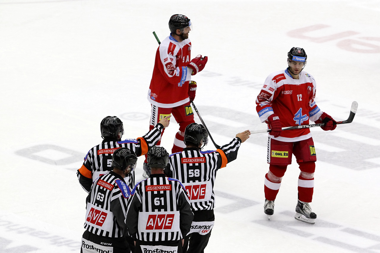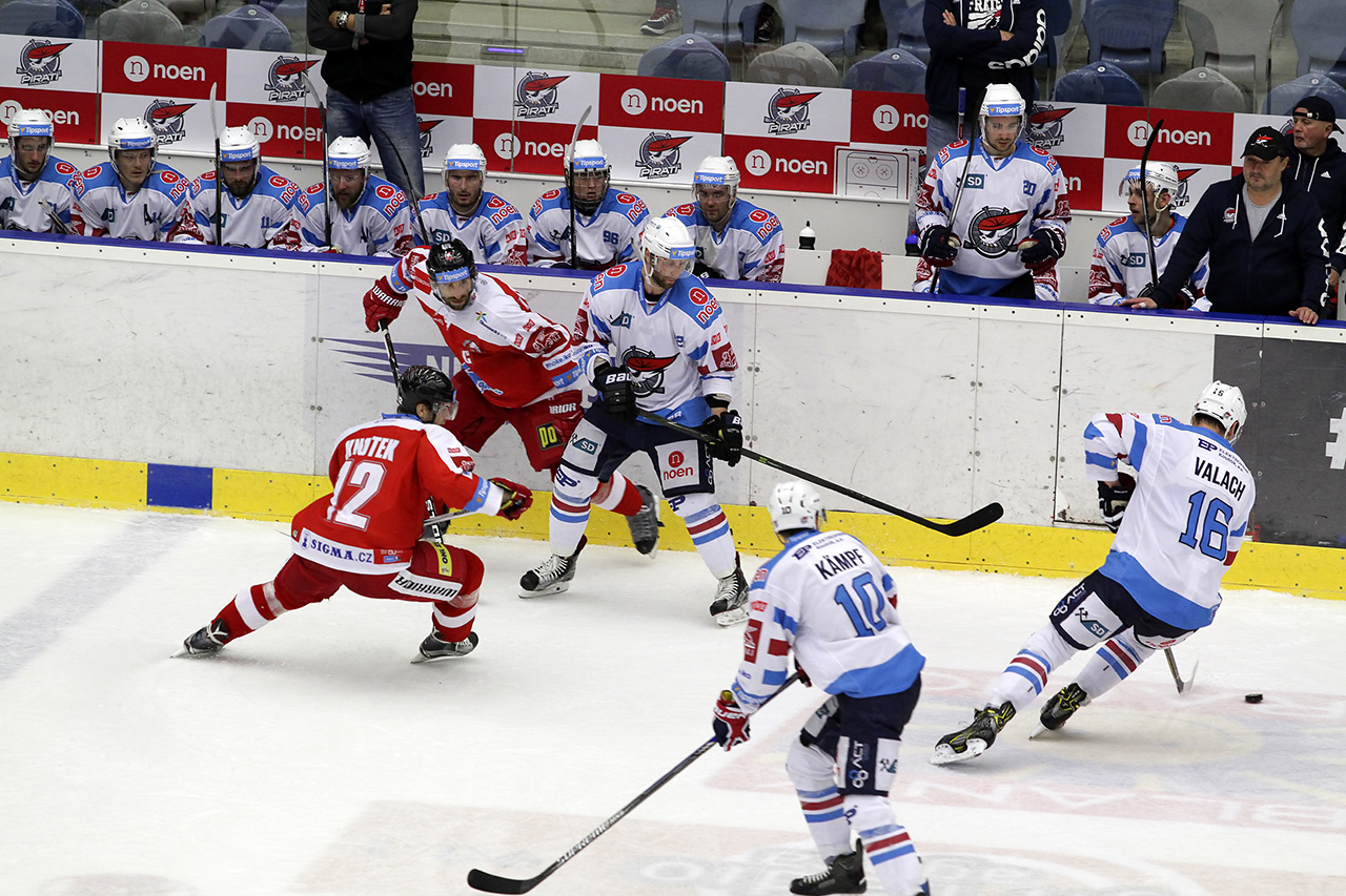 Michal Poletín padá k zemi po ataku už ležícího Petra Strapáče, do souboje u zadního mantinelu přijíždí David Kämpf a olomoucký mladíček Jakub Galvas