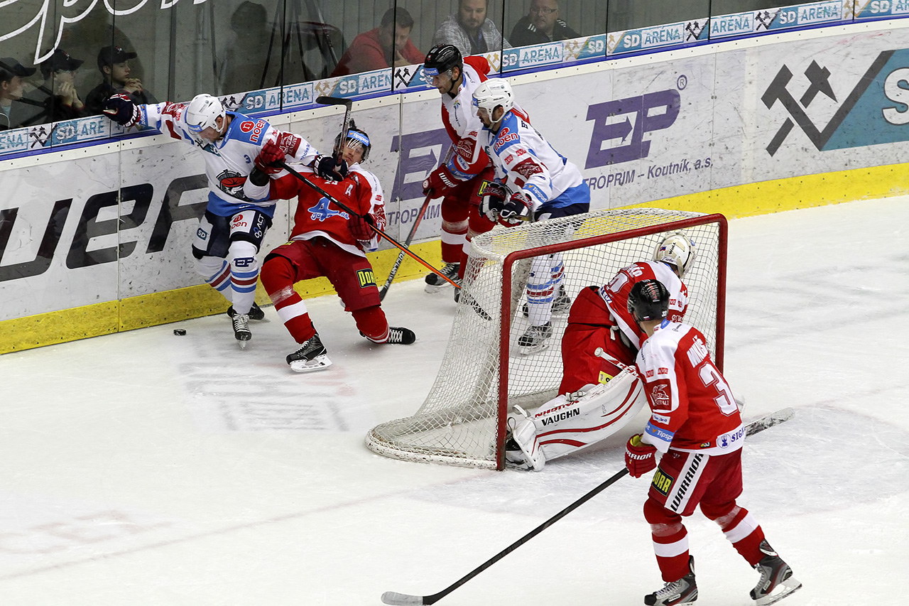 Tomáš Kudělka a Jan Rutta bojují za vlastní brankou o puk s Petrem Strapáčem a Janem Eberlem