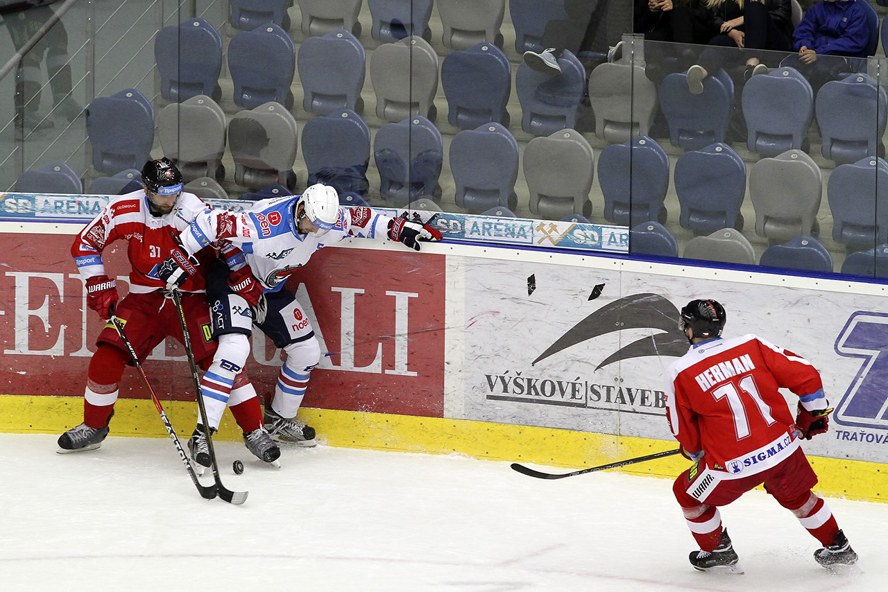 Brett Skinner a Juraj Mikúš před Janem Strmeněm sledují, jak se vyvine souboj v rohu obranného pásma Pirátů