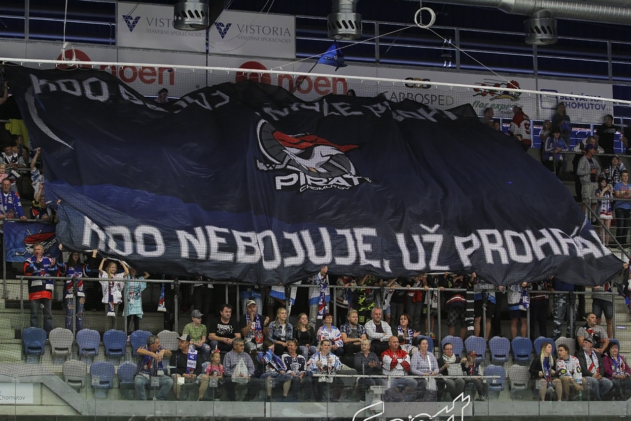 Pavel Klhůfek vidí kotouč jako první a už se dere za prvním gólem Pirátů v základní části 2018/2019