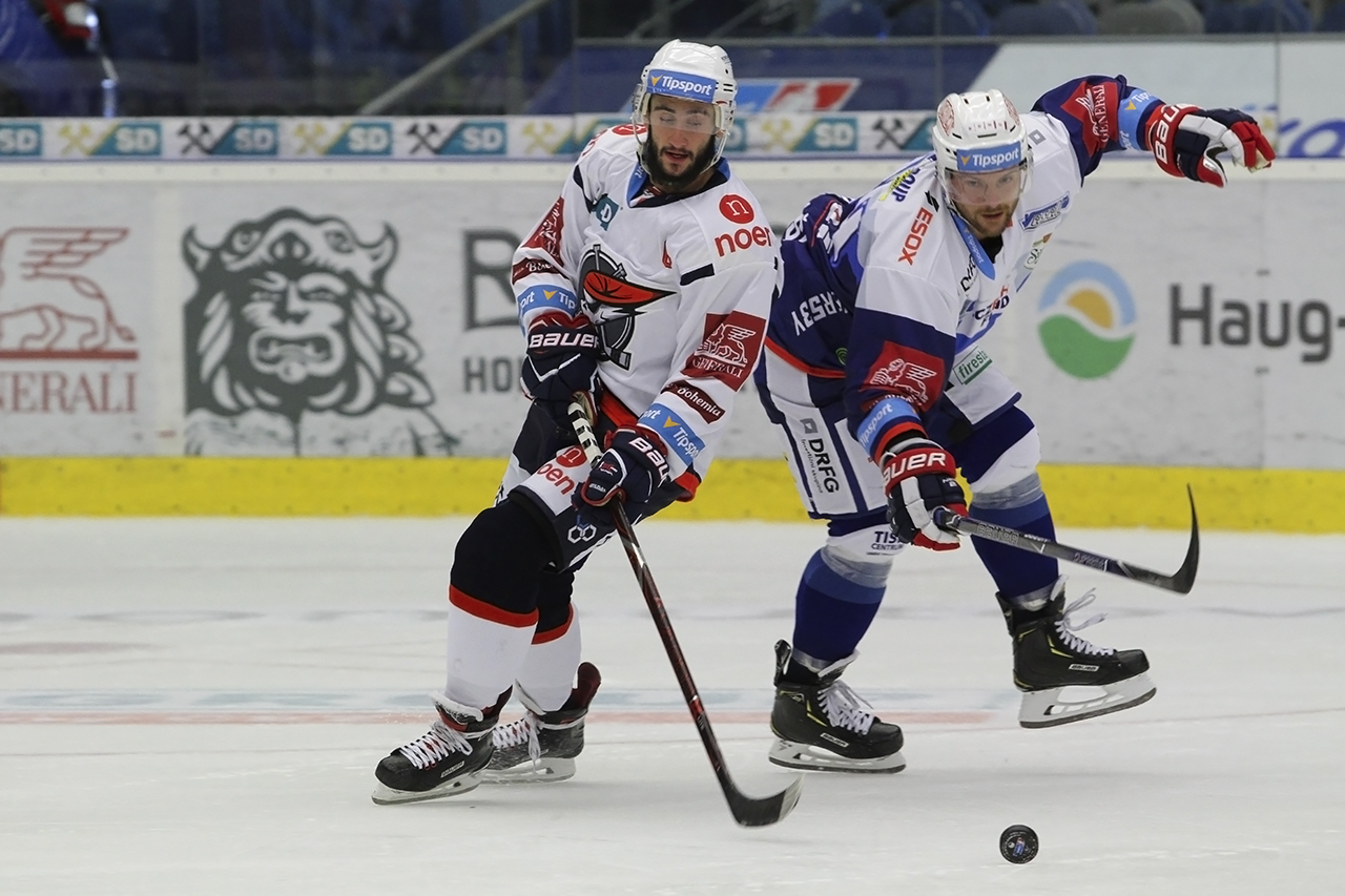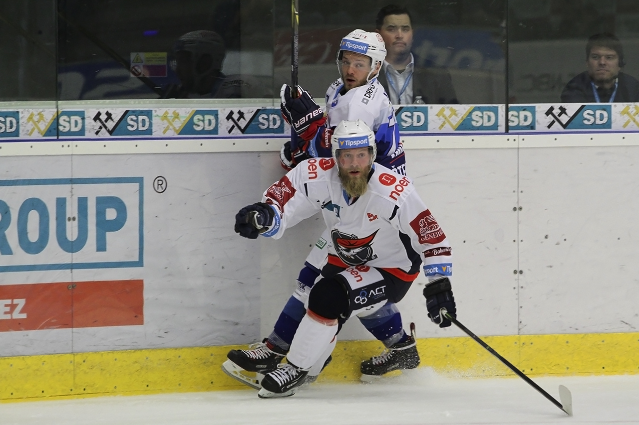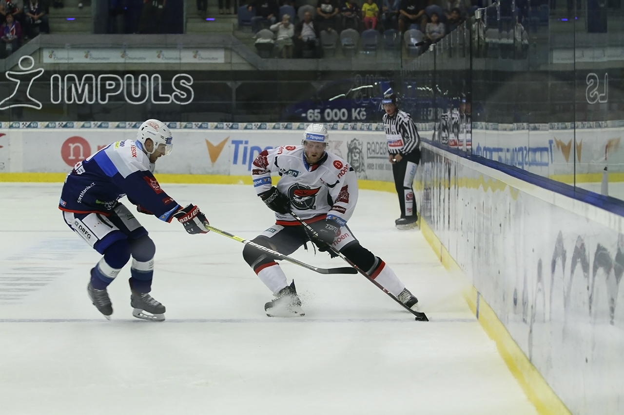 Pavel Klhůfek bojuje o prostor s Michalem Gulašim krátce předtím, než vstřelí první gól Pirátů v základní části 2018/2019