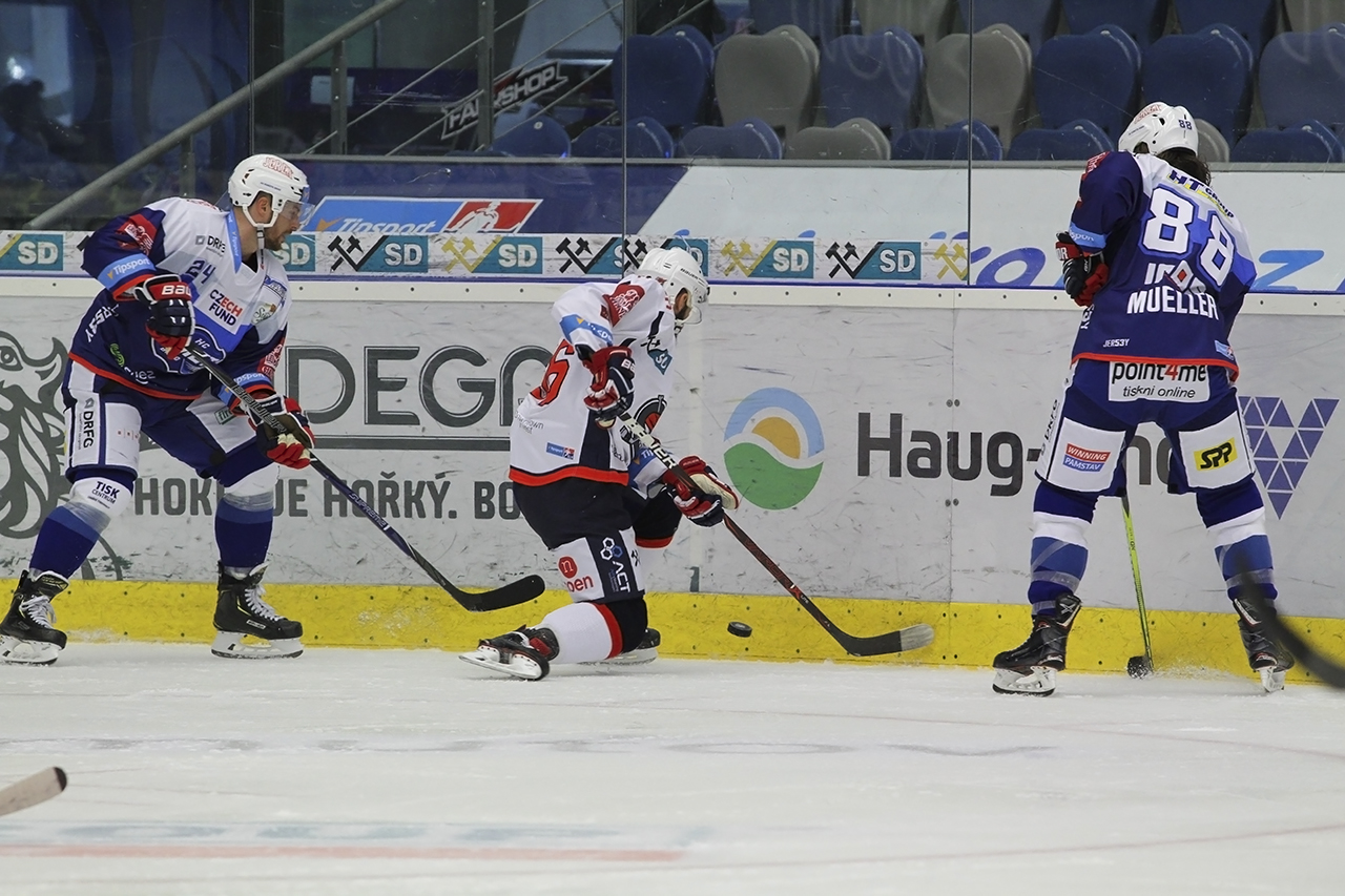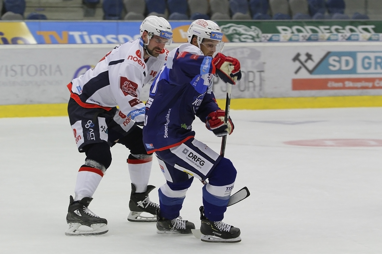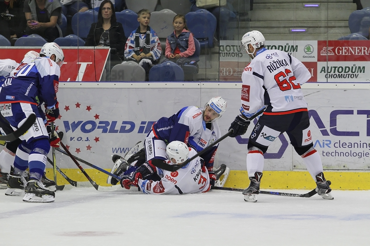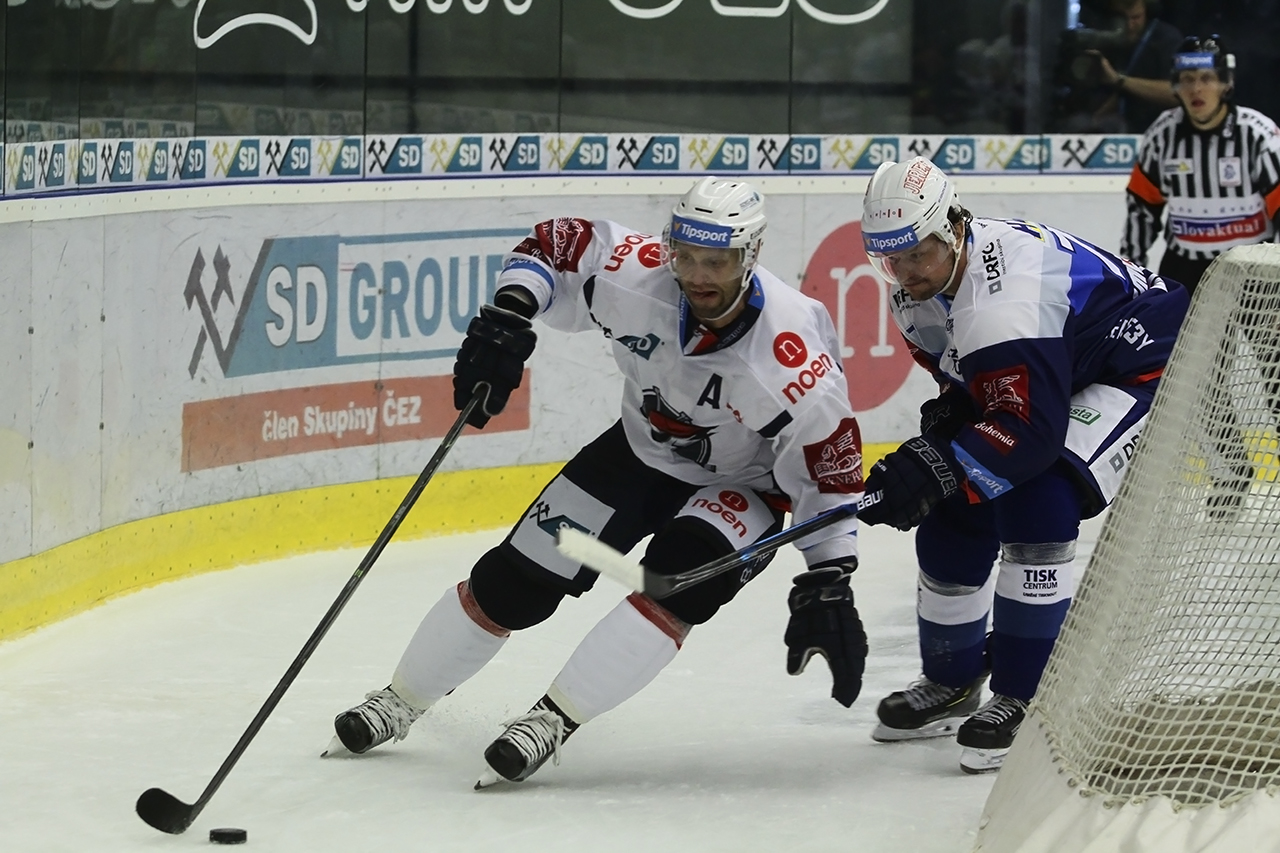 Pavel Klhůfek bojuje o prostor s Michalem Gulašim krátce předtím, než vstřelí první gól Pirátů v základní části 2018/2019