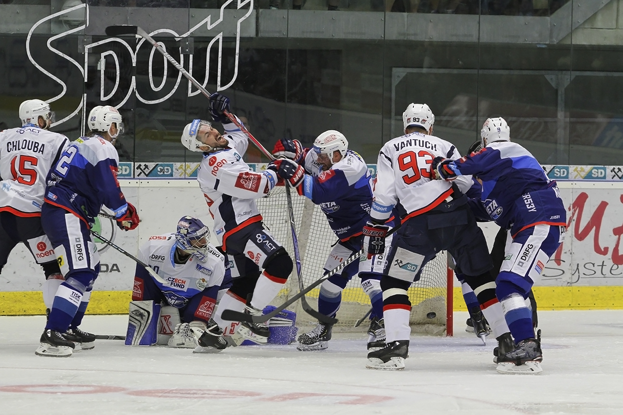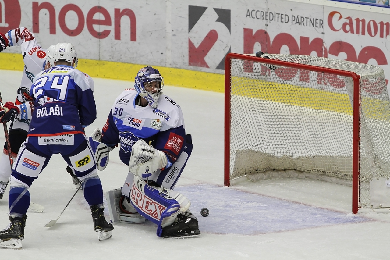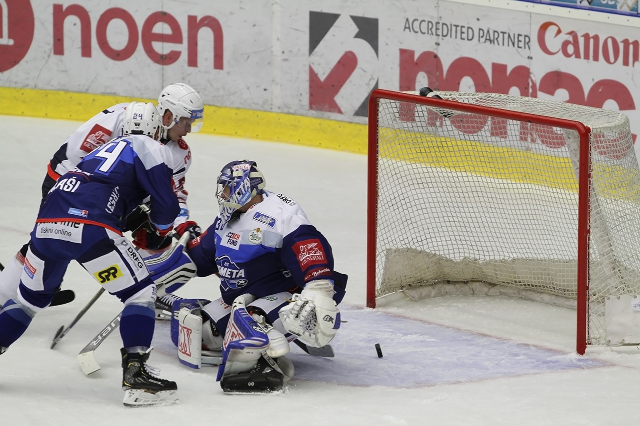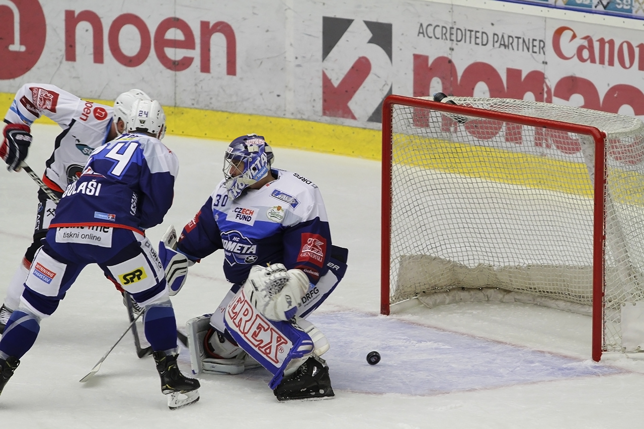 Petr Koblasa nestihl zasáhnout puk, než ho Marek Langhamer schoval pod lapačku
