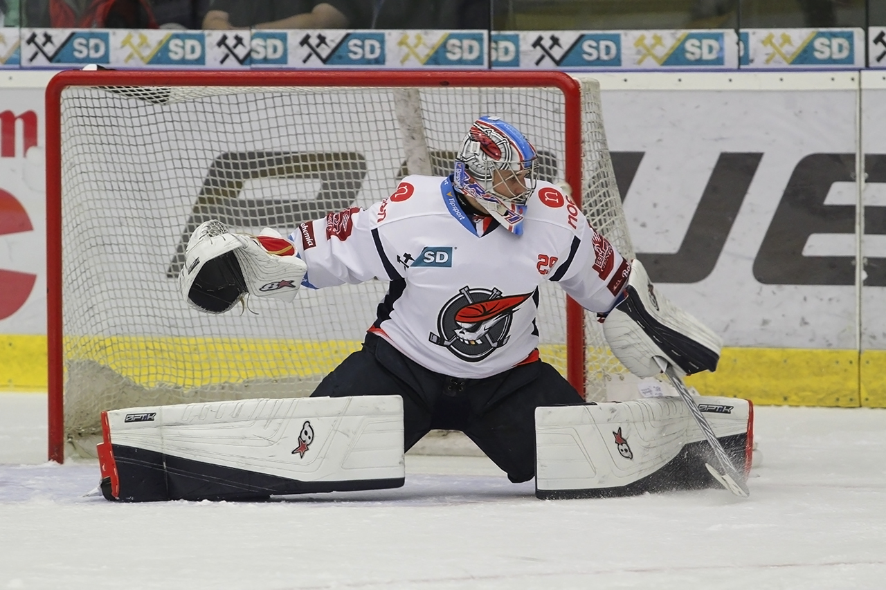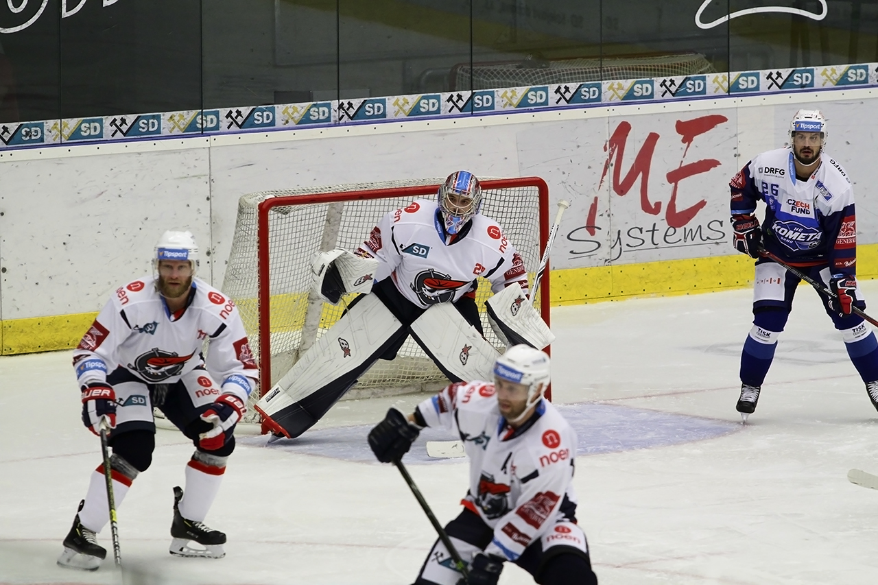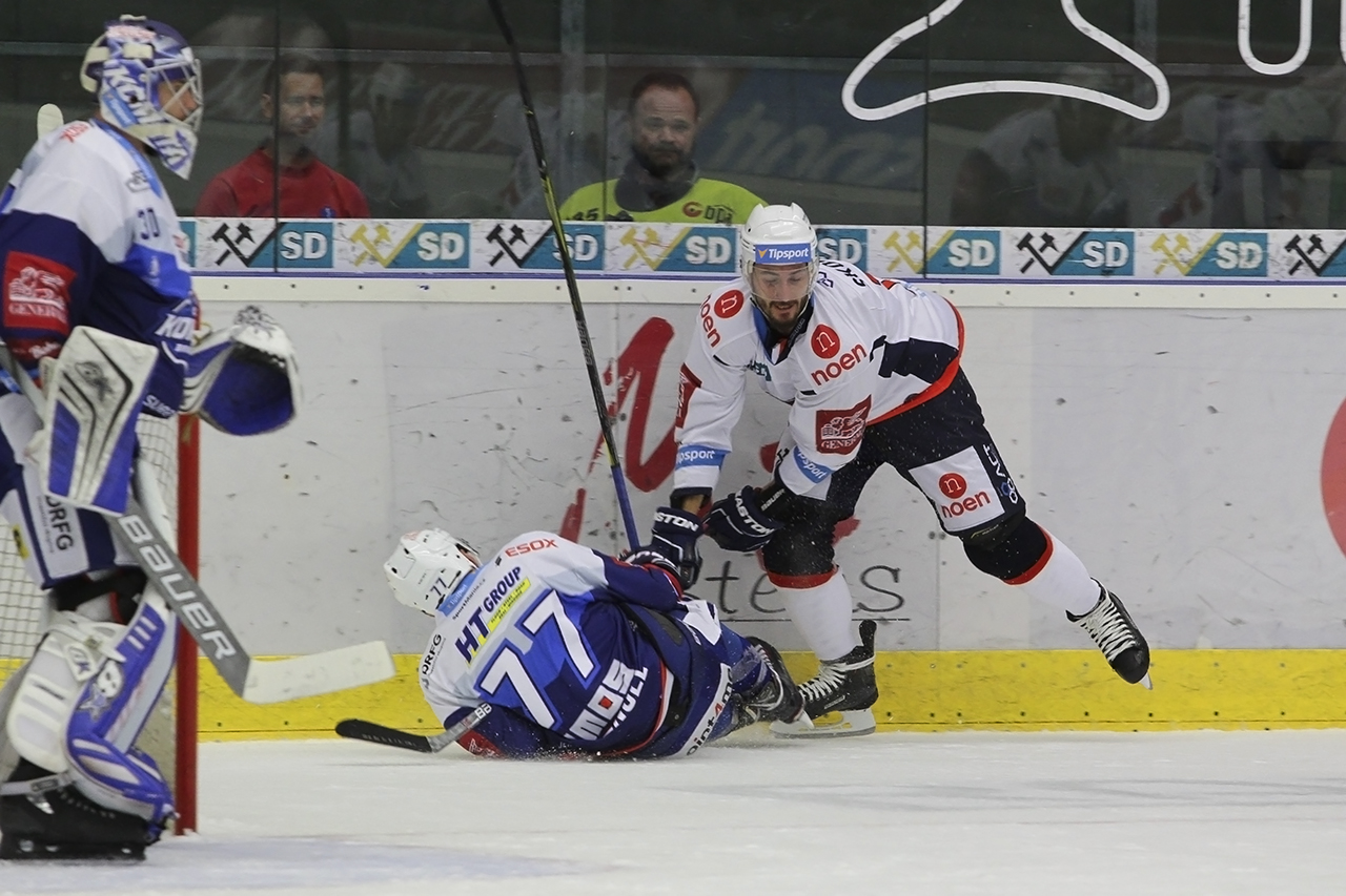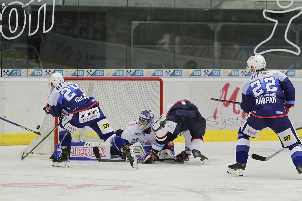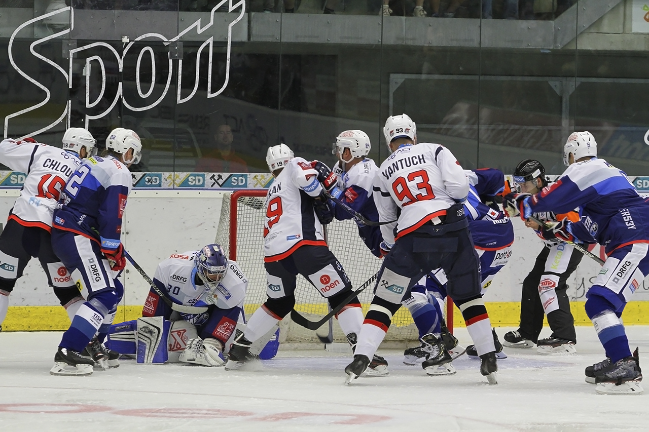 Petr Koblasa nestihl zasáhnout puk, než ho Marek Langhamer schoval pod lapačku