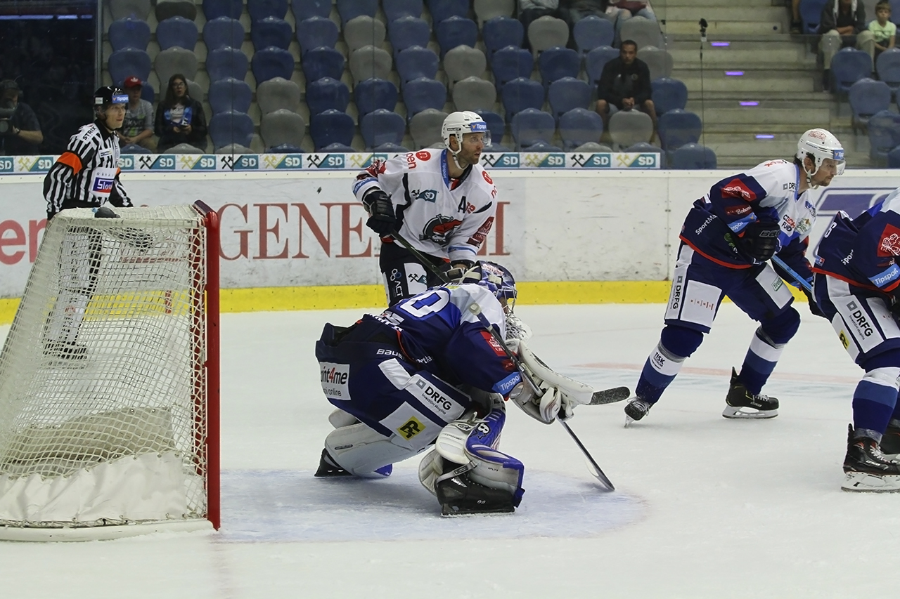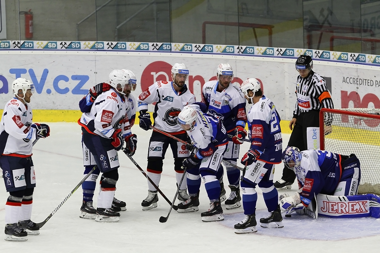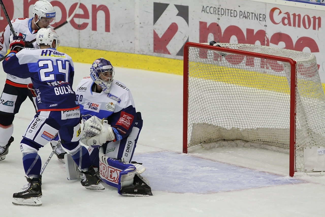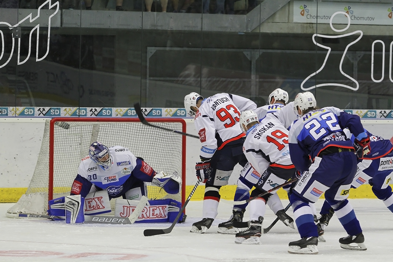 Petr Koblasa nestihl zasáhnout puk, než ho Marek Langhamer schoval pod lapačku