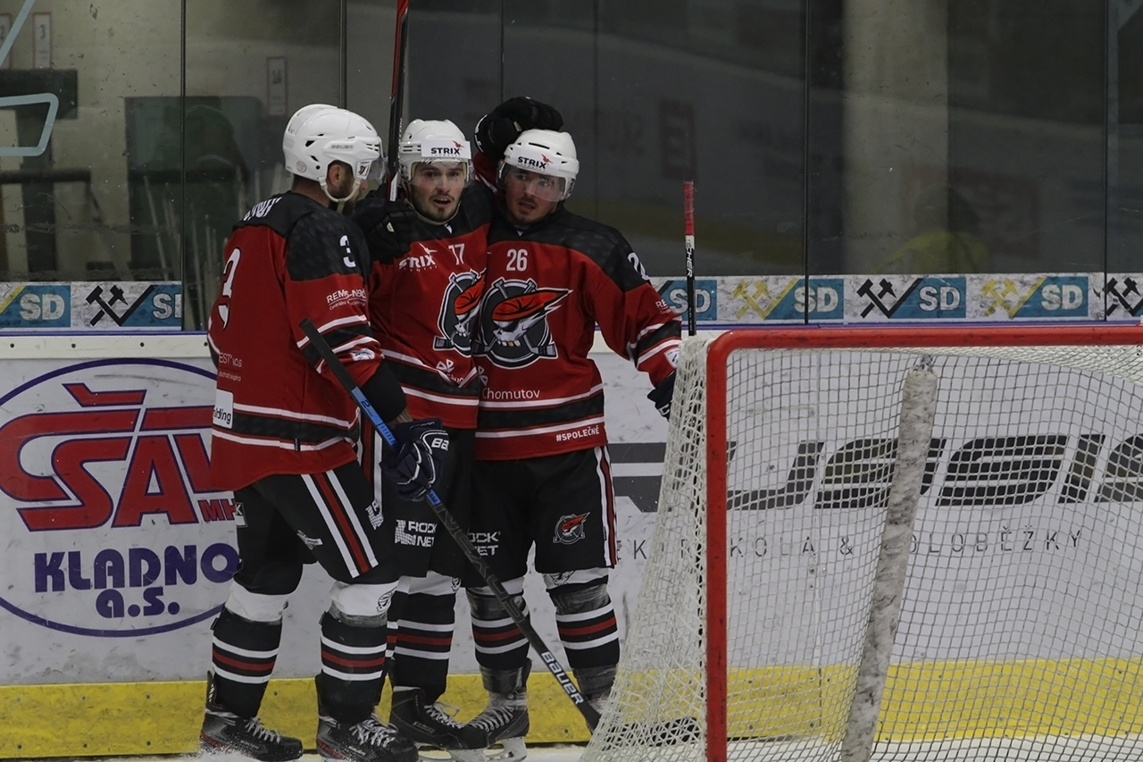 Josef Rindoš se otáčí do rohu a spolu s ním i kadaňský brankář Ondřej Pešek a obránce Radek Jenček