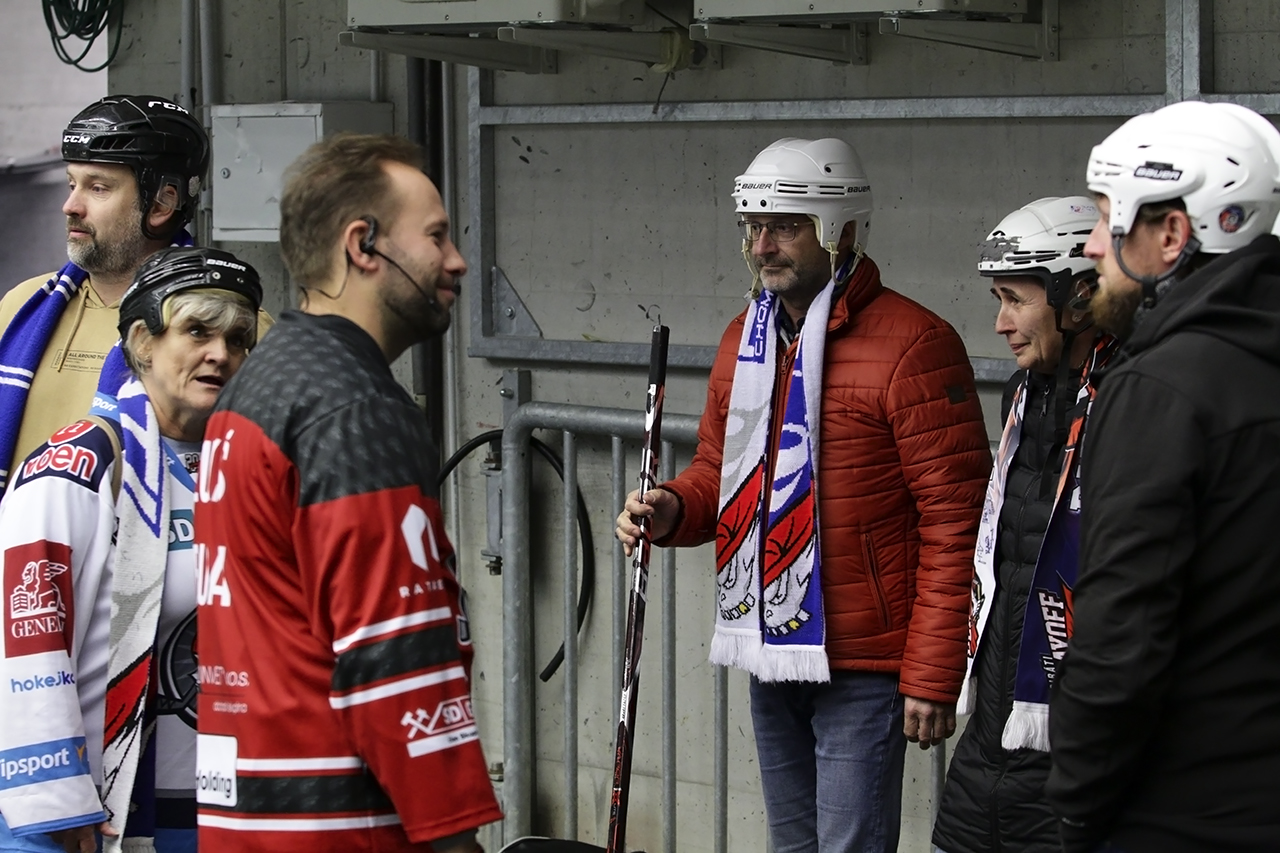 Michal Žižka sleduje další z gólů v kadaňské síti na multimediální kostce