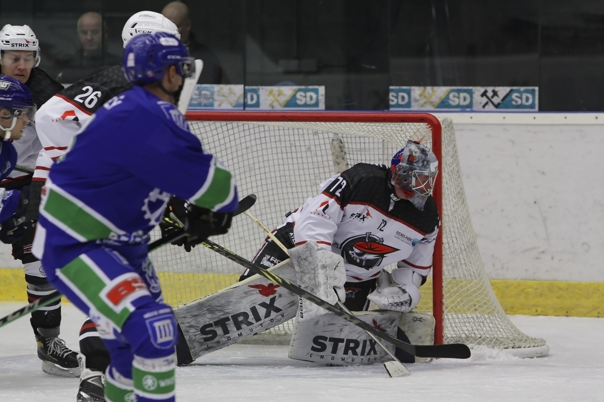 Milan Kostourek před hronovskou brankou atakovaný lapačkou Kryštofa Ševců