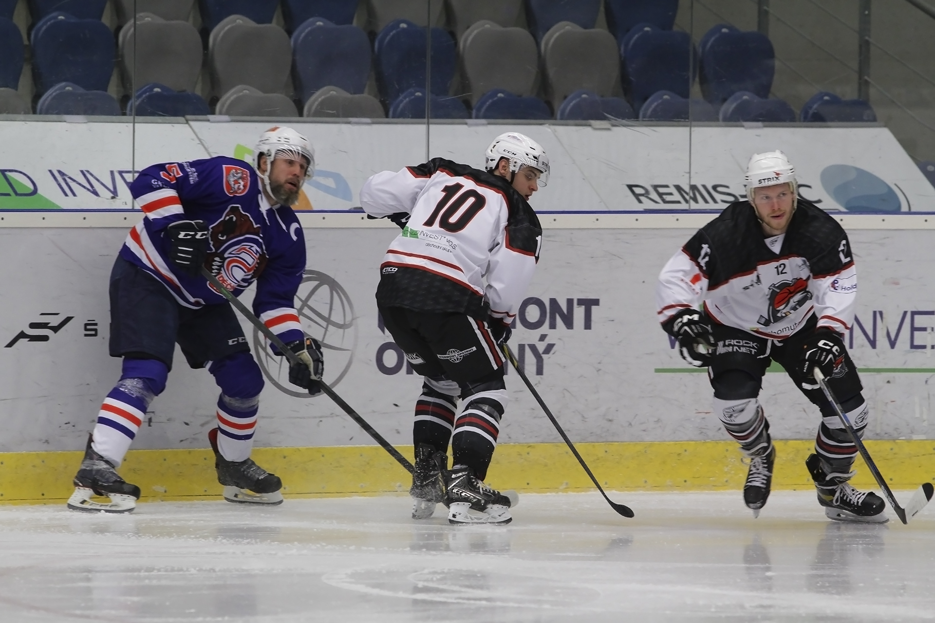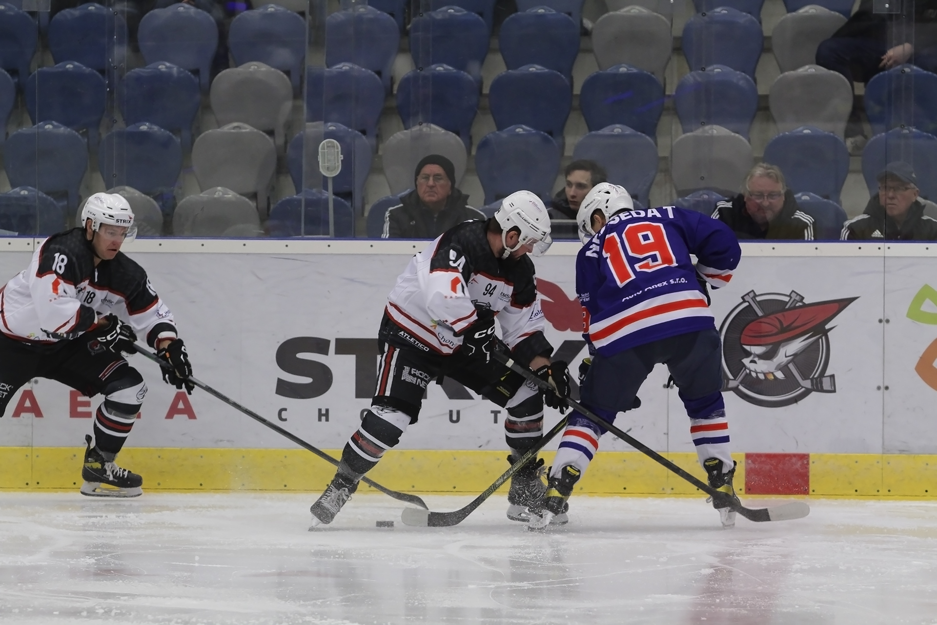 Jakubové Matai (číslo 18) a Chrpa bojují o puk s Tomášem Nezbedou