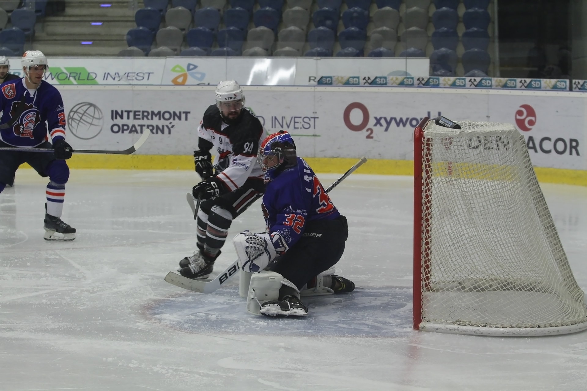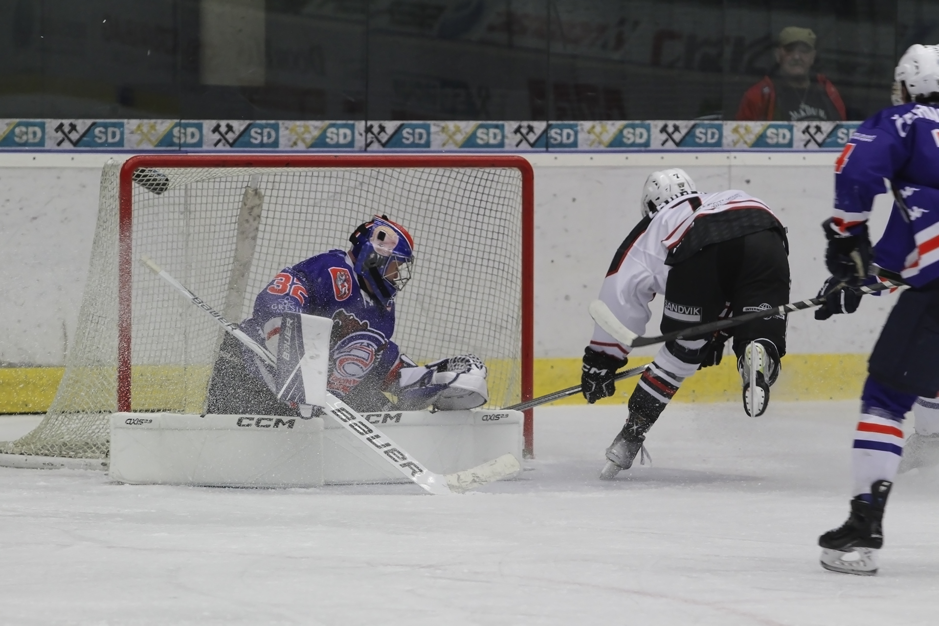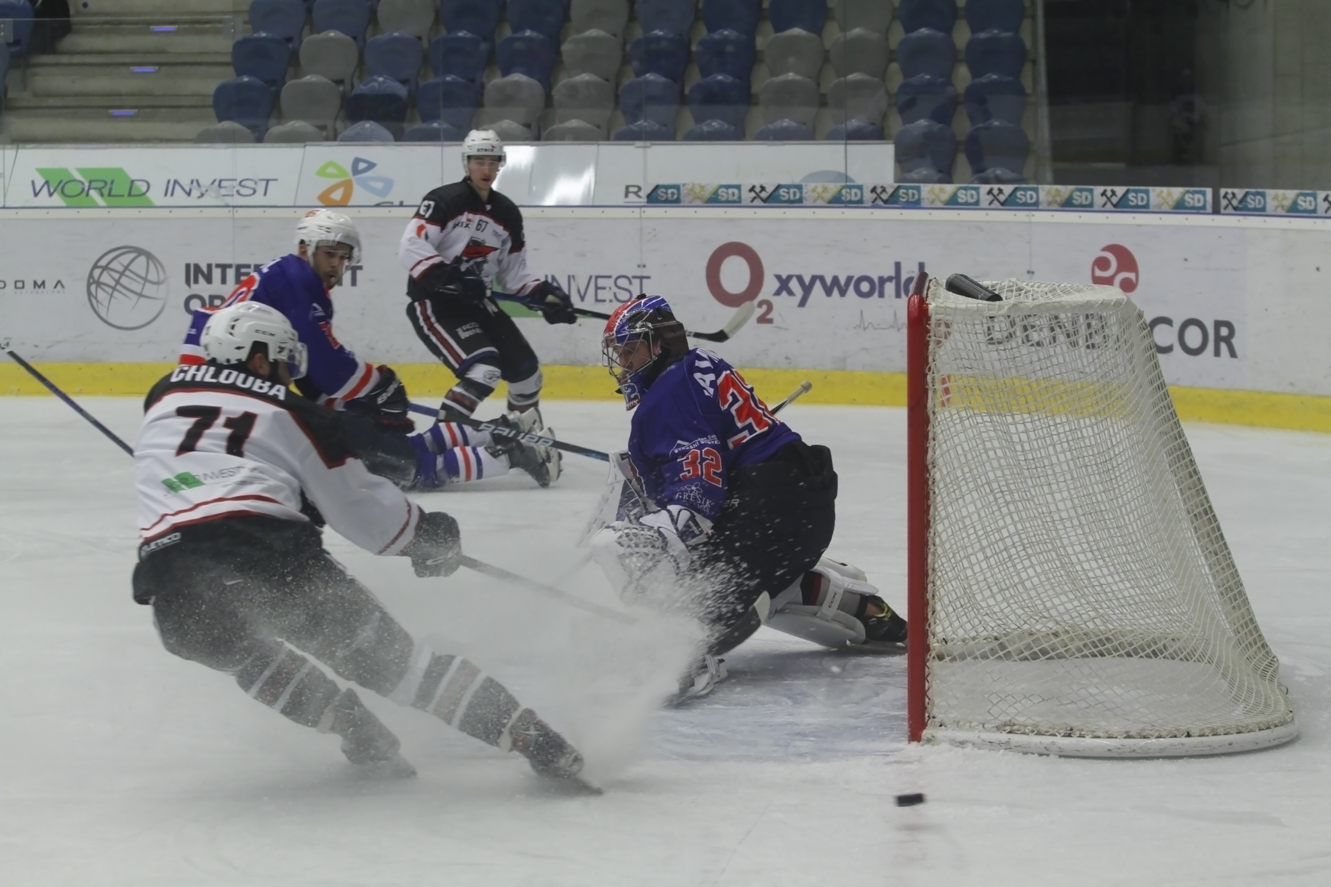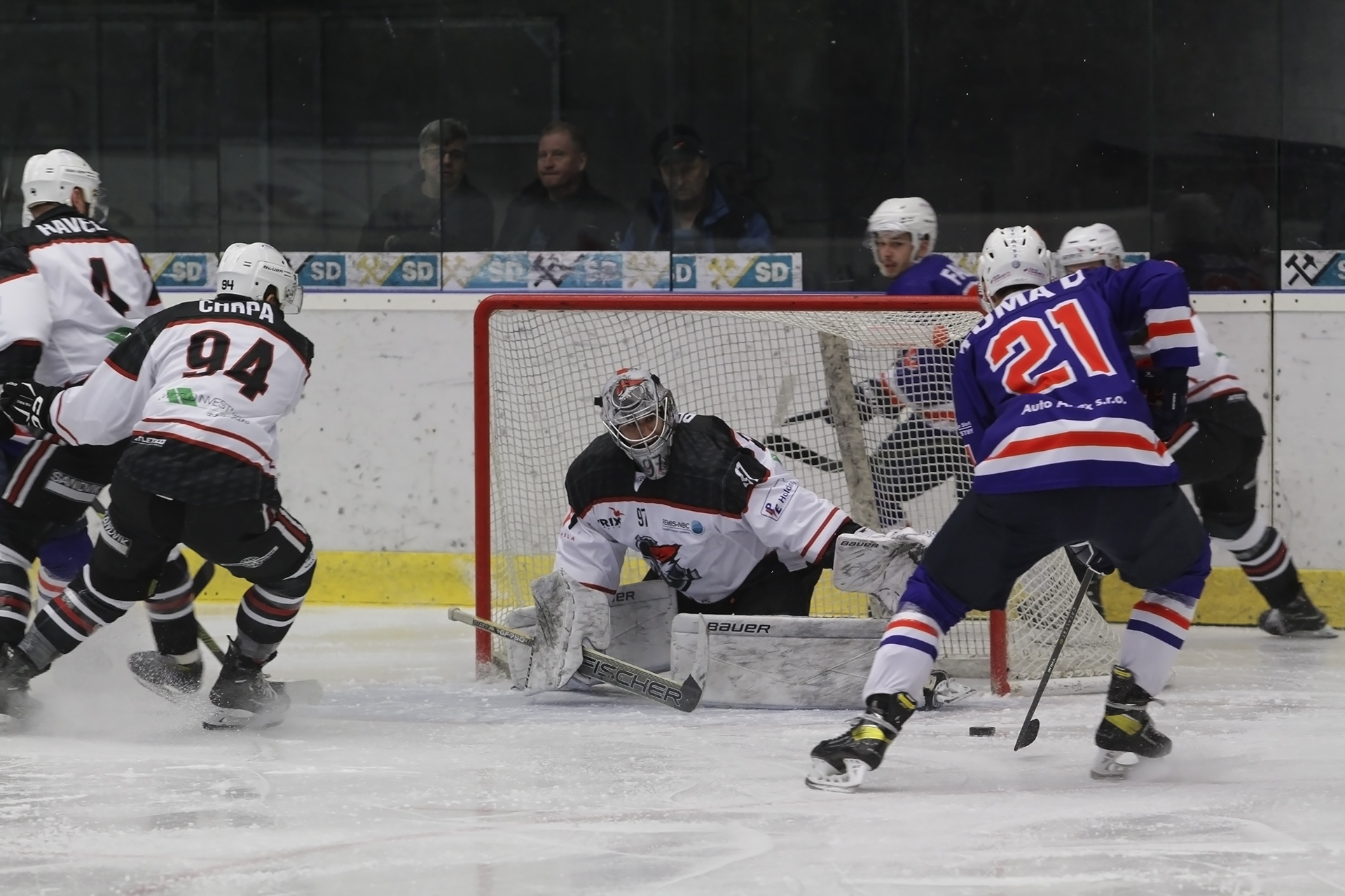 Richard Běhula se snaží zastavit střelu Davida Tůmu, který nakonec zvýšil na 2:0 pro Děčín