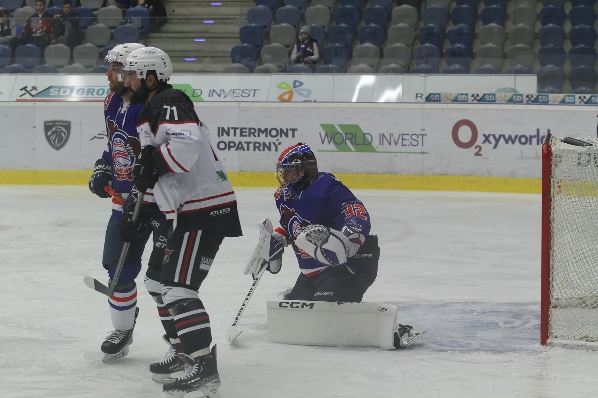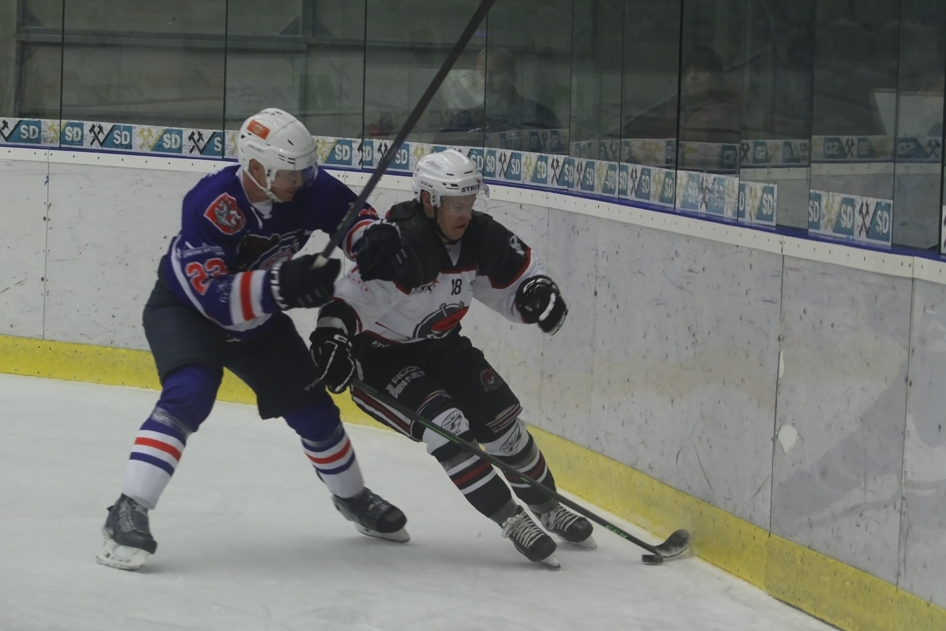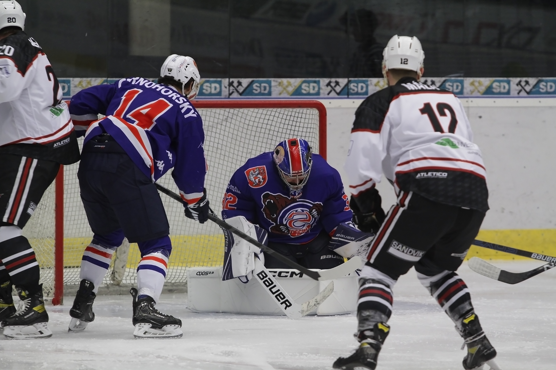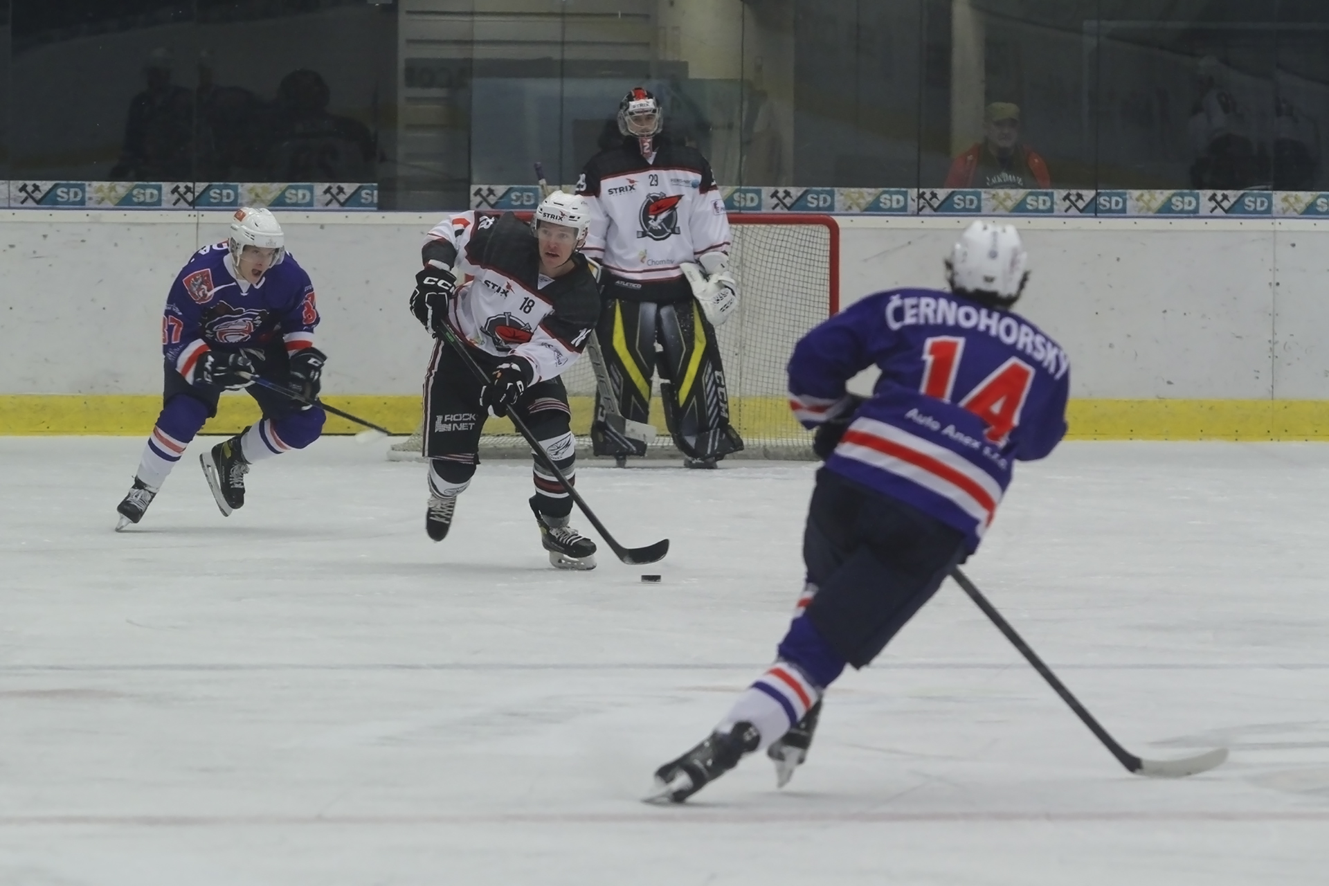 Richard Běhula se snaží zastavit střelu Davida Tůmu, který nakonec zvýšil na 2:0 pro Děčín