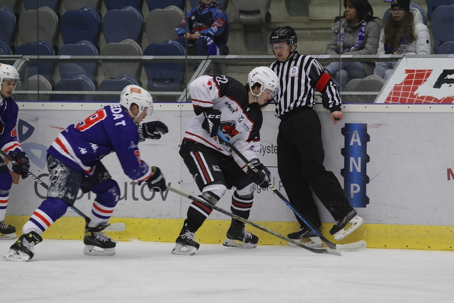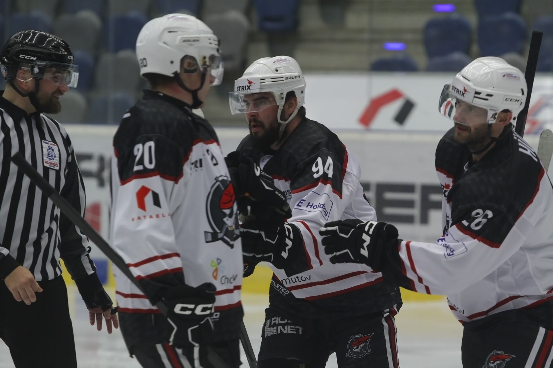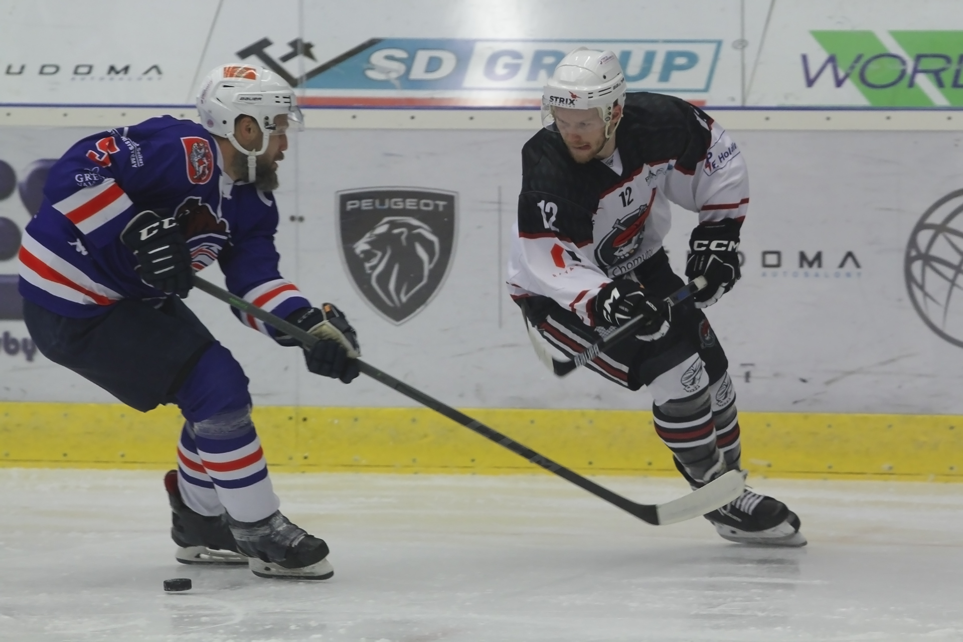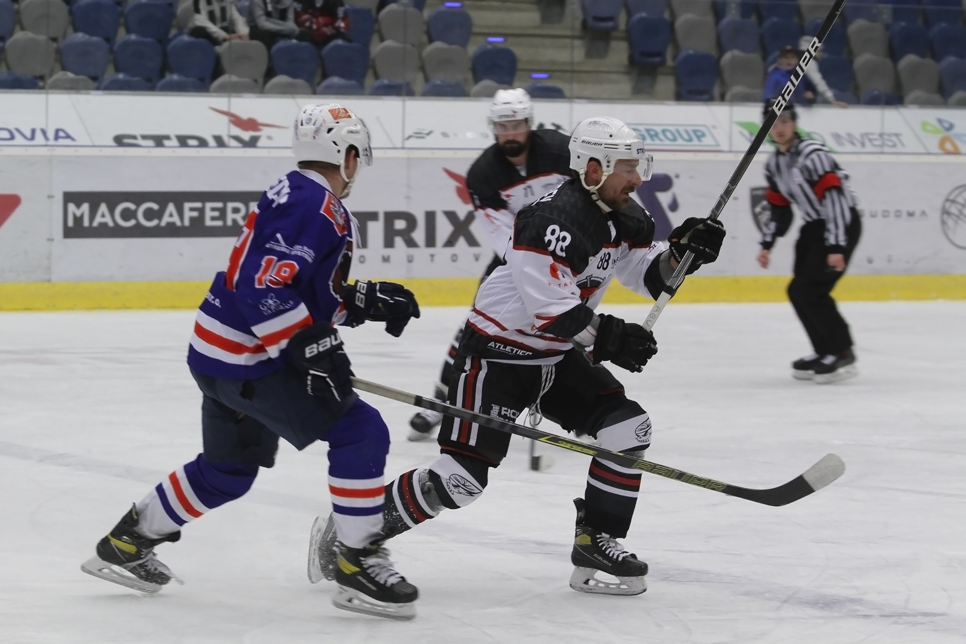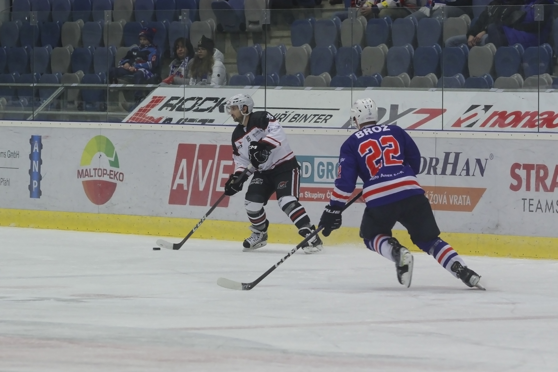 Lukáš Lavinger inkasuje z hokejky Jakuba Mataie, který poslal duel 18. kola do prodloužení