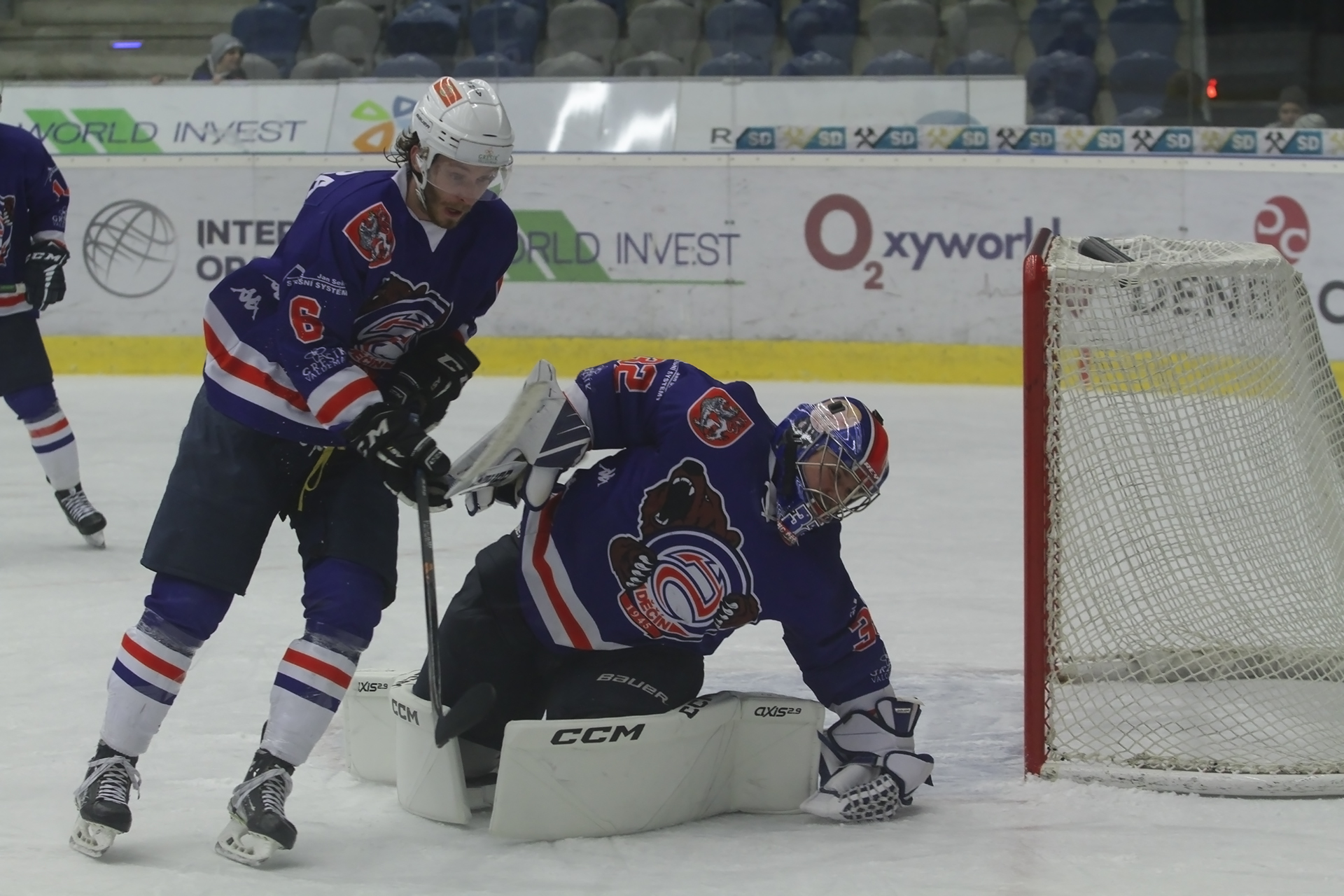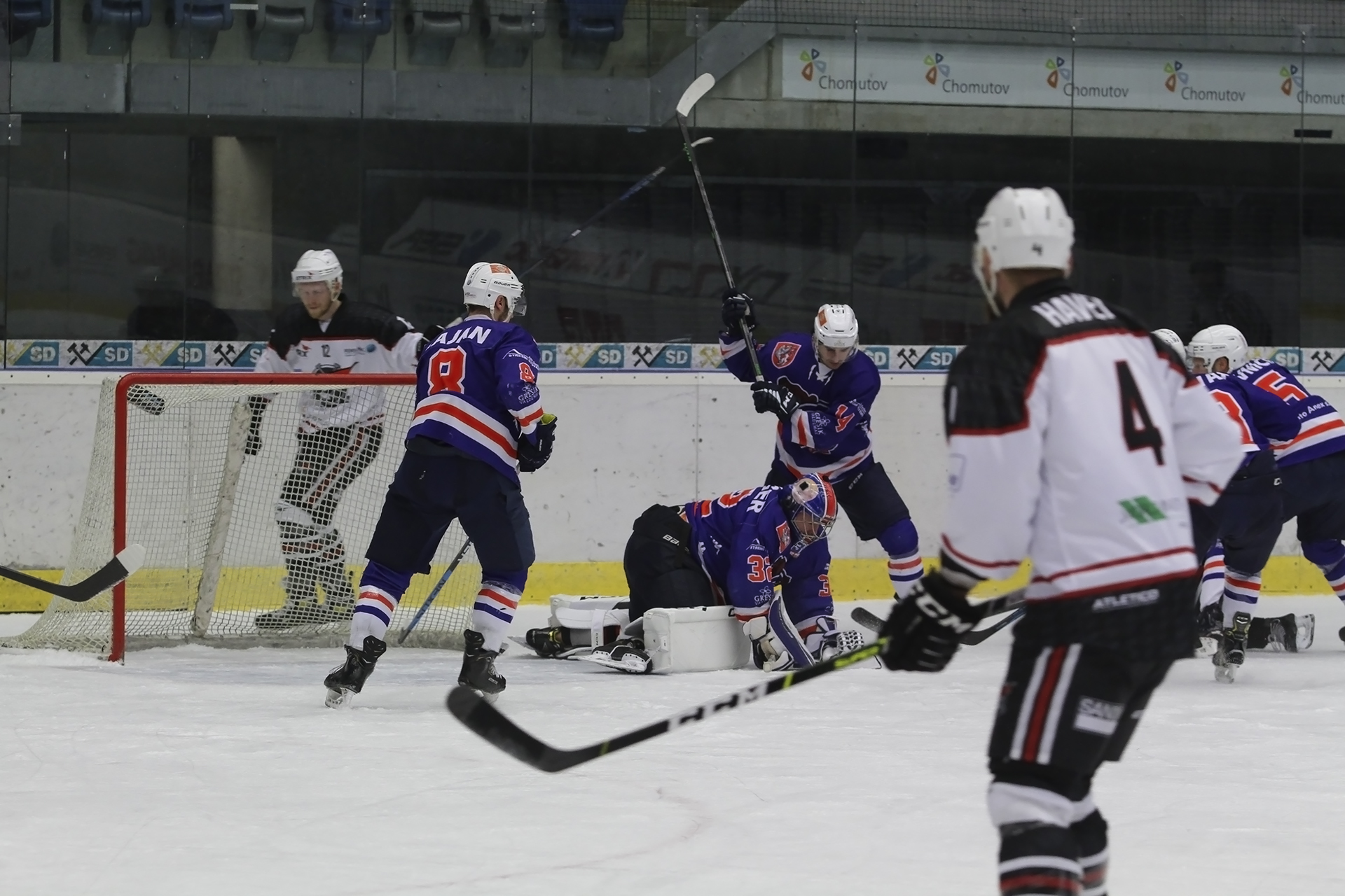 Štěpán Němec zakončuje přes hokejku Vladimíra Brože