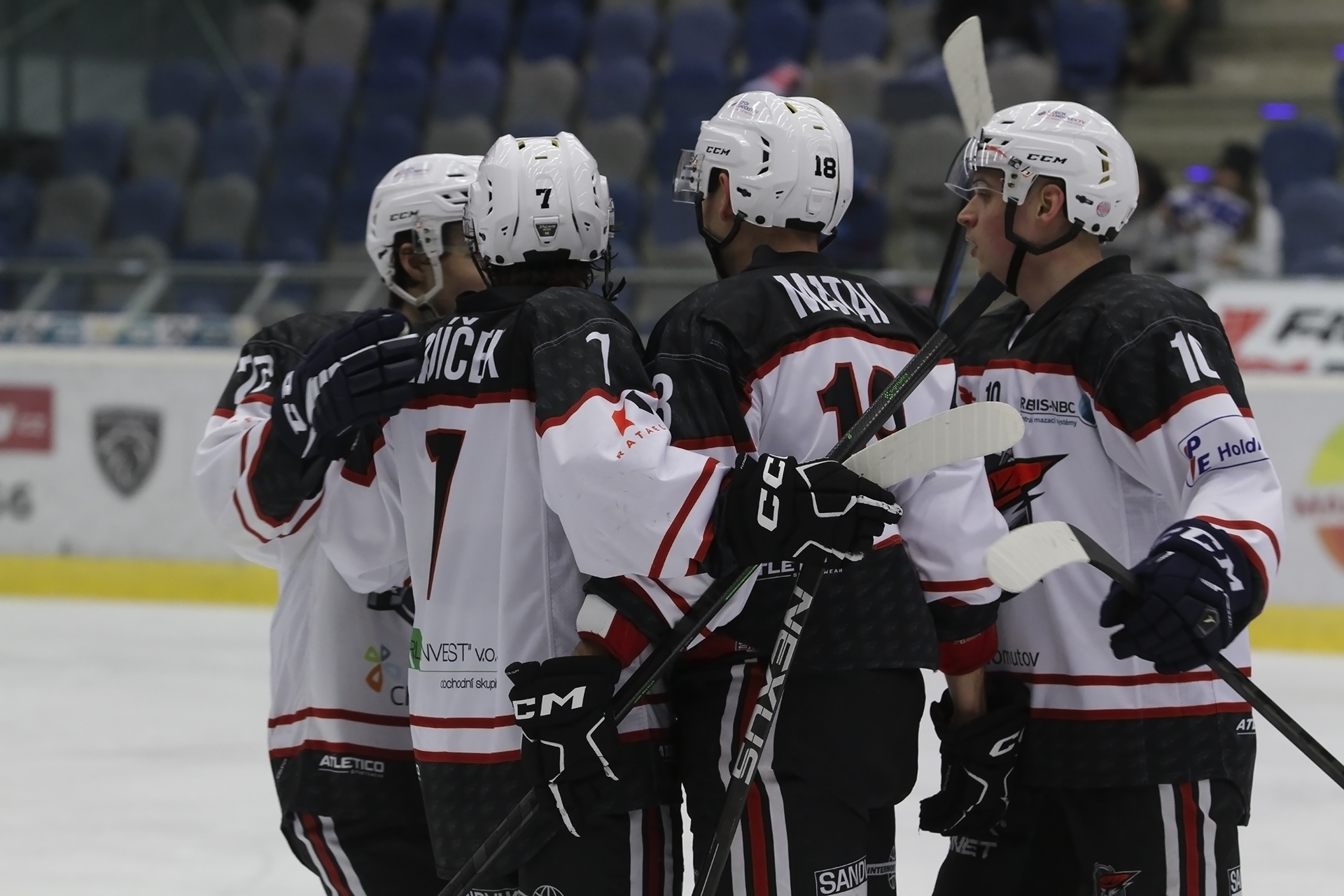 Jakub Chrpa slaví první gól Pirárů s Tomášem Koblížkem (číslo 20) a Viktorem Hüblem