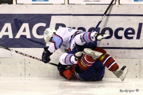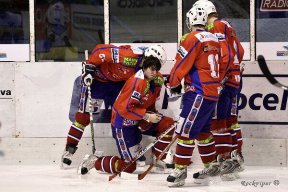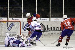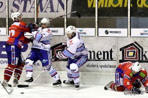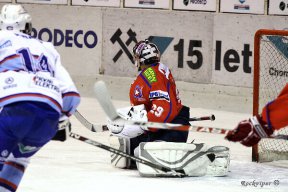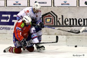 TREÚvodní třetina zápasu základní části patřila hostům z Třebíče. Dobře napadli, bruslili a bránili střední pásmo. Důkazem toho byla tutovka Roda, kterému Hanuljak sebral skoro jasný gól. Hned vzápětí se ale předvedl domácí Jelínek, který ale nastřelil jen tyč hostující branky. Tempa hry se ale ujali opět hosté. V další stoprocentní šanci se ocitl Zahradník, ale opět Hanuljaka nepřekonal. Utkání se hrálo v mírném tempu, a tak ani vyloučených nebylo moc. Hosté měli dokonce čtyřminutovou přesilovou hru za faul Mazance, ale nedokázali ji využít, a tak byl stav po první třetině 0:0.