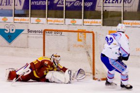 I do závěrečné části bílomodří vlétli a už ve druhé minutě svítilo červené světlo za zády Vajnera počtvrté. Branislav Fábry napálil volný kotouč po buly směr Vajner a trefil se přesně pod vyrážečku mladého brankáře - 4:0. O dvě minuty později dostal dostatek prostoru Jaroslav Hašek, který si mohl s kotoučem na holi vybruslit před Vajnera a přesnou střelou vyhnal všechny pavouky z levého horního rohu - 5:0. Šestá branka domácích přišla po dalších dvou minutách. Krásnou akci zahájil Jakub Trefný, když na modré zadovkou přenechal kotouč Míkovi, ten rychle přiťukl Fábrymu a ten ač sám před Vajnerem ještě situaci vylepšil na zakladatele celé akce a pro toho již nebyl problém trefit odkrytou branku - 6:0. Dukla si poté vzala oddechový čas. Ten zastavil chomutovský brankostroj a sedm minut před koncem se do rychlého kontru dostala dvojice Lukáš Krupka a zakončující Tomáš Hradecký, který střelou z první překonal Lundella a dal tak výsledku utkání konečnou podobu.