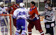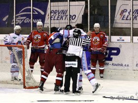 Hned úvod utkání napověděl, že to nebude klidný zápas. Po pár minutách hry se do sebe pustili Radek Duda s hostujícím Šulcem, za což dostali čtyři, respektive šest minut trestu. Z přesilové hry ale Havlíčkobrodští nedokázali nic vytěžit. První vážnější šanci měl na hokejce Procházka, ale nedokázal překonat Furcha v brance hostů. Hned vzápětí se radovali hosté. V přesilové hře se objevil před domácí brankou Vojtěch Němec a na několikrát protlačil kotouč pod Hanuljakem do brány - 0:1. Poté měli obrovské šance domácí Skořepa s Jírou, ale ani ty si cestu do brány nenašly. Ba naopak. Pár vteřin před koncem první třetiny si najel,opět v přesilové hře, před domácí branku Jan Knotek a z těsné blízkosti vsítil druhou branku Brodu - 0:2.