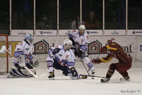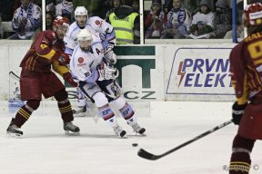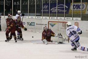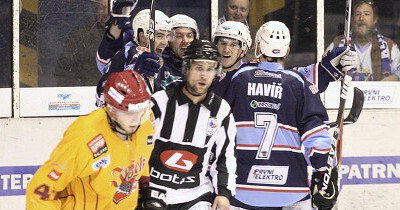 JIHZačátek prvního semifinálového utkání playoff se nesl v duchu nepřesností na obou stranách. Po jedné z nich byl hned po minutě hry vyloučen domácí Mucha, ale vzápětí se hrálo ve čtyřech, protože proti pravidlům se provinil také Bakus. Domácí byli aktivnější a důkazem budiž i střela Havíře, která ale skončila mimo branku. Modrobílí se probíjeli do jedné šance za druhou, ale žádnou z nich nedokázali využít díky skvělému Řehořovi v brance. V první třetině rozdal rozhodčí po třech dvouminutových trestech na obou stranách, a tak se v plném počtu často nehrálo. Jihlavští také měli několik slibných šancí, ale většinou končily nepřesností ve finální přihrávce nebo na Hylákovi. První třetina skončila smírně bezbrankovou remízou.