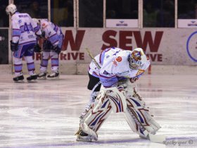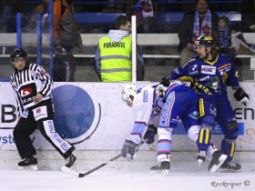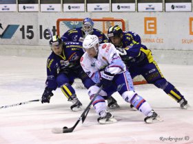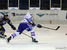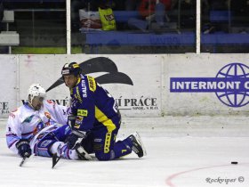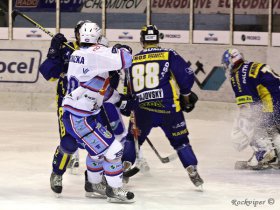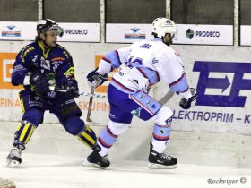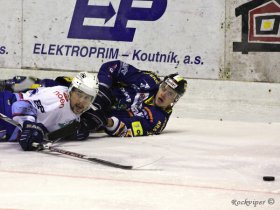 SUMUtkání ještě pomalu ani nezačalo a už se otevírala dvířka na hostující trestné lavici, nedovoleným zákrokem si pomohl Hulva. V přesilové hře domácí několikrát nebezpečně hrozili, ale Hylák v brance Draků ze Šumperka byl pozorný. V sedmé minutě se poprvé výrazněji ukázali hosté, ale Chatrnúch na Hanuljaka nevyzrál. O minutu později přišli na řadu domácí. Po několika střelách na Hyláka se kotouč odrazil mezi kruhy k úplně volnému Radku Dudovi a ten se do poloodkryté branky nemýlil – 1:0. Domácí poté ještě více oživili hru. Hostující hráči se takřka nedostali ke střele a jen koukali na svého brankáře, jak ukrývá další a další kotouče v lapačce. I díky skvělým zákrokům právě Hyláka byl stav po první třetině jen 1:0.