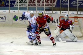 Třetí třetina byla již hodně vyhrocená a to z obou stran. Důkazem byla i strkanice, v níž se ocitl Fiala s Mockem, oba si šli na dvě minuty odpočinout na trestnou lavici. Následovala vyloučení na obou stranách a hra tedy byla hodně útržkovitá. První vážnou akci ve třetí třetině a vyrovnání měl na hokejce Vágner, ale ani jednou ze čtyř pokusů nedokázal posunout kotouč za ležícího Hanuljaka. Hra najednou dostala rychlé otáčky, hra se přelévala ze strany na stranu. Nikdo z hráčů však nechtěl udělat osudnou chybu, která by stála jeho tým body. Závěr třetiny byl opět ve znamení častých vyloučení, ale skóre se do konce třetiny již nezměnilo. Pro Chomutovské tak přišlo na řadu první prodloužení v sezóně.