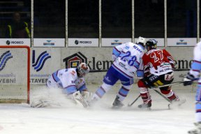 Začátek druhé třetiny byl lepší pro domácí hráče. Několikrát se dostali až před Růžičku, ten však všechny šance zneškodnil. Ve 24. minutě se však již domácí dočkali. František Bombic ujel obráncům na modré čáře a střelou z těsné blízkosti umístil přesně k pravé tyči hostující branky - 1:1. Domácí ale jakoby přestali hrát a výsledkem byla dvakrát přesilovka pro hosty. Hosté se však nedokázali usadit v útočném pásmu, vyjma jedné akce. Na konci druhé přesilovky vystřelil obránce od modré čáry a zmatený Hanuljak nevěděl kde má kotouč. Ten ležel na brankové čáře, ale naštěstí pro domácí ho nikdo z útočníků nestihl doklepnout do brány. Po této akci měli několik příležitostí i domácí hráči, ale ani ve dvojnásobné přesilovce nedokázali protlačit kotouč za výborného Růžičku. Stav po druhé třetině byl tedy 1:1.