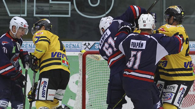 LITSeveročeské derby mělo hned od začátku velký náboj. O něco aktivnější byli domácí Piráti. Na gól se nemuselo dlouho čekat. Ke konci šesté minuty otevřel skóre zápasu Martin Šagát. Ten využil spolupráce svých spoluhráčů Hřebejka a Sikory a ladnou otočkou dokázal dostat puk za záda brankáře Francouze.