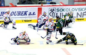 CHMHned první akce Karlových Varů znamenala velké nebezpečí pro chomutovského gólmana Kostúra. Pechově formaci se podařilo rozložit defenzivu Pirátů a Kumstát z dobré pozice z levé tyčky minul, Drtina následně mířil jen do středu branky. Tento závar byl však v úvodní třetině spíše ojedinělý a v dalším průběhu hře dominovaly spíše obrany obou týmů.