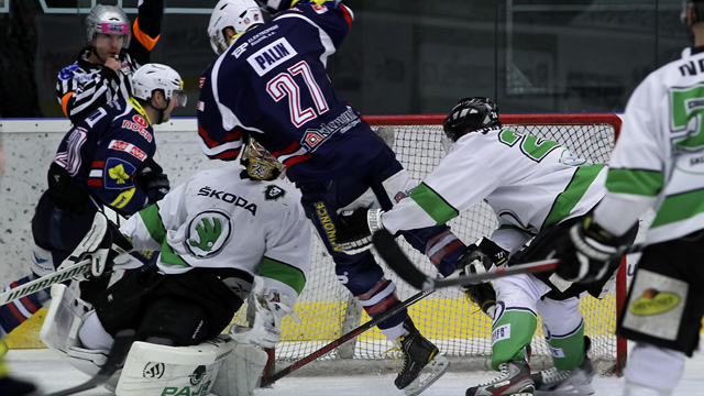 CHMHned úvod poznamenala kolize Milana Tomana se Štěpánem Hřebejkem, který skončil s otřesem mozku na nosítkách. Hra po této události byla trochu vypjatější, padlo i několik dvouminutových trestů, avšak po jejich uplynutí se už vrátila do normálu a oba týmy se soustředily na střelbu. Miroslav Hanuljak si snadno poradil jak s Vrbatovým prudkým nahozením, tak s Hrdelovou souhrou s Rysem. Obrovskou příležitost promarnil najíždějící si Lukáš Pabiška, nedokázal však u pravé tyče trefit přihrávku od mantinelu. Boleslavský Michal Valent měl také plné ruce práce, když zneškodnil Trefného kolmý pokus a nebezpečný závar ve 14. minutě, v němž ho hosté zasypali několika prudkými střelami z mnoha pozic.