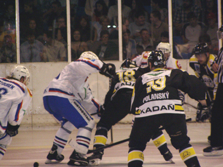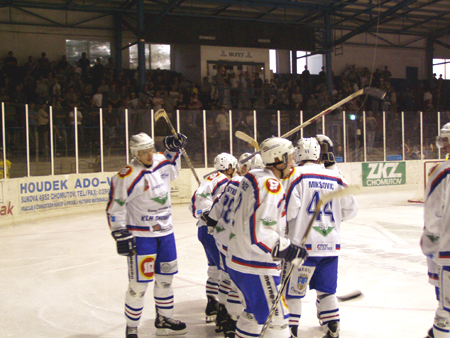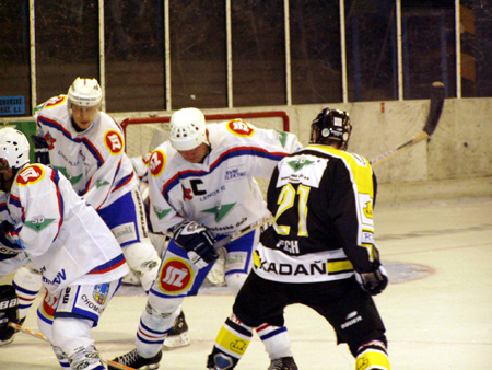 KADI ve druhé částí mohly slušně zaplněné chomutovské tribuny vidět stejný obraz hry. Logickým vyústěním tlaku domácích byla ve 23. minutě vedoucí branka. Stanislav Mikšovic sice ještě tváří v tvář Fikrtovi neuspěl, jeho střela se však odrazila k Michalu Jeslínkovi, který pohotovou střelou otevřel skóre – 1:0. O chvíli později musel zasahovat Kamil Jarina proti střele Kašíka. Do protiútoku se rozjeli Šíp s Bouškem na jediného obránce, avšak první jmenovaný namířil střelu jen do Fikrta. Z tempa vyvedlo Chomutov až vyloučení a následná vyrovnávací branka. Nechytatelnou střelou pod břevno se o ni postaral Petr Punčochář - 1:1. Kadaňští hokejisté se ale neradovali dlouho. O necelé dvě minuty později přejel útočnou modrou čáru domácí kapitán Radek Šíp a svou střelou překvapil Fikrta – 2:1. Těsné vedení držel pro domácí Kamil Jarina, který si poradil i s bekhendovým blafákem kadaňského Kašíka. S blížící se polovinou utkání odskočili domácí na rozdíl dvou branek. V přesilové hře napřáhl na modré Martin Nosek, jehož střela prošla Fikrtovi mezi betony – 3:1. Hosté se snažili zvrátit vývoj utkání, ale jejich střely s přehledem likvidoval Kamil Jarina, kterého úvod sezony zastihl ve skvělé formě. Potom už ale otěže zápasu vzali opět pevně do svých rukou domácí a Fikrt se měl co ohánět, aby udržel stávající skóre. Skvělou individuální akcí, kdy přešel přes dva kadaňské obránce až před branku, se prezentoval Ladislav Boušek. Následně našel Plaček dlouhým pasem na modré stojícího Jeslínka, jehož nájezd však přerušil svým hvizdem hlavní rozhodčí, jenž se chystal vylučovat. Do konce druhé části mohli diváci shlédnout ještě chomutovskou akci na jeden dotek, kdy puk putoval po ose Liška, Šíp, Boušek až k Fikrtovi.