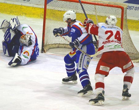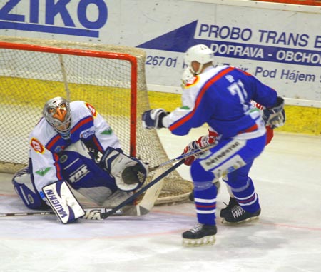 Brankář Hübl kryje před dotírajícím berounským útočníkem.